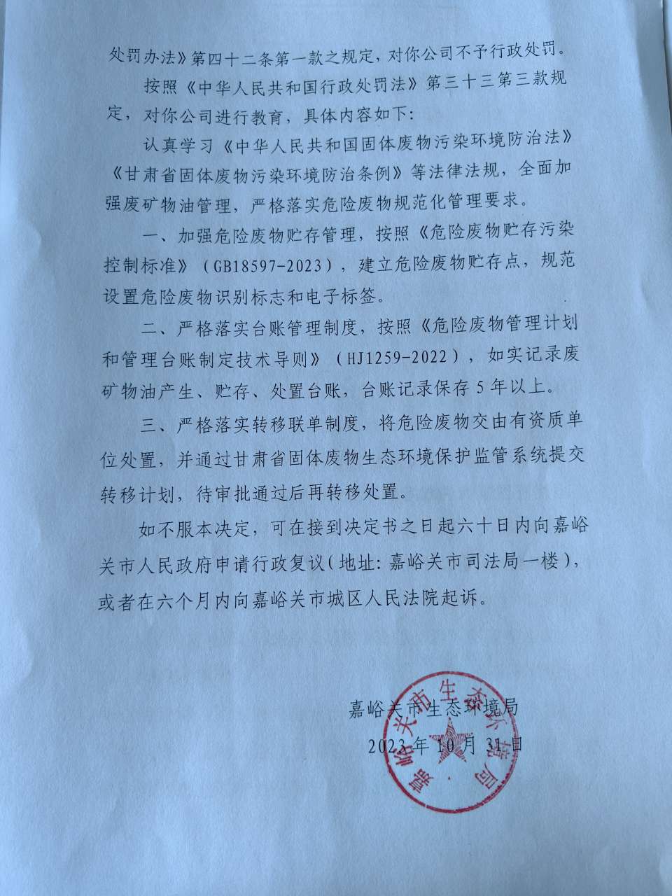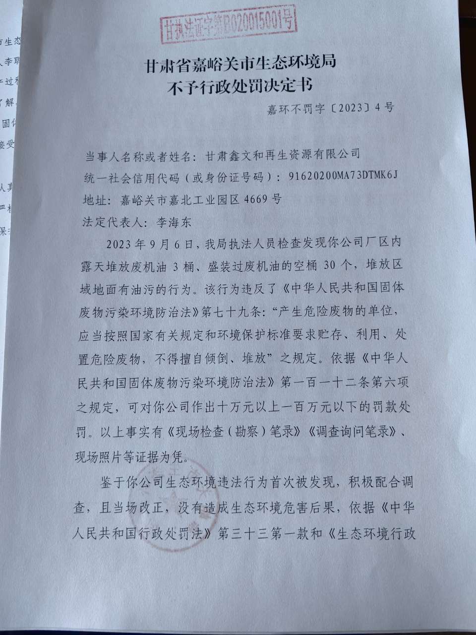 甘肃鑫文和再生资源有限公司(嘉环不罚字〔2023〕4号)