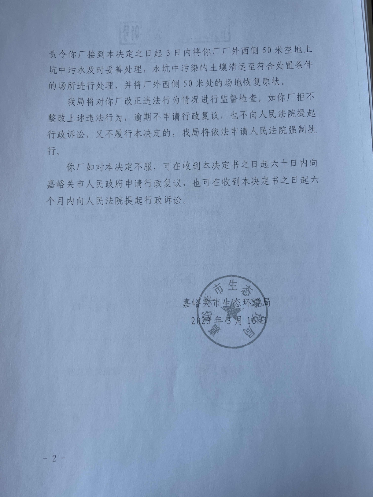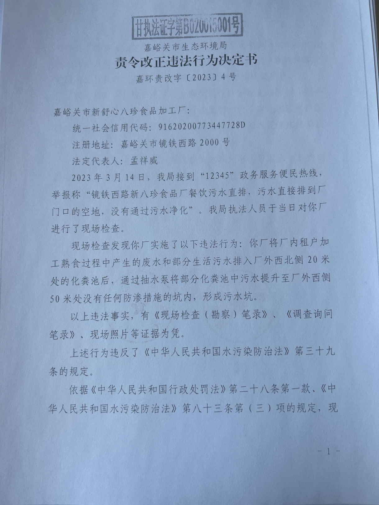 嘉峪关市新舒心八珍食品加工厂责令改正违法行为决定书(嘉环责改字[2023]4号)