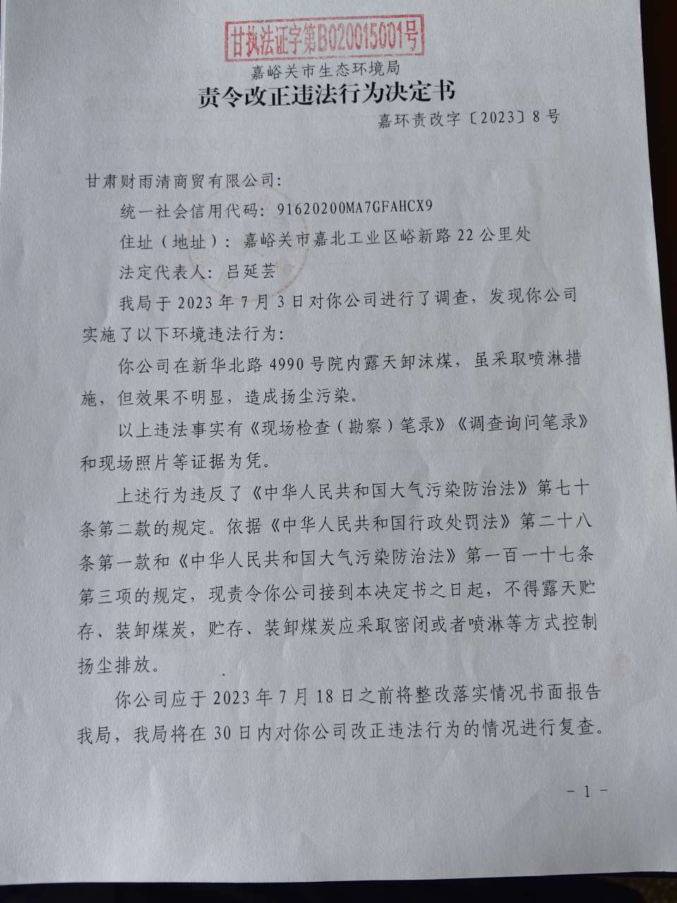 甘肃财雨商贸有限公司责令改正违法行为决定书(嘉环责改字[2023]8号)