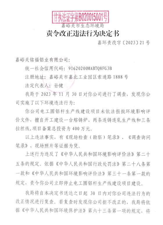 嘉峪关铭福铝业有限公司(嘉环责改字〔2023〕21号)
