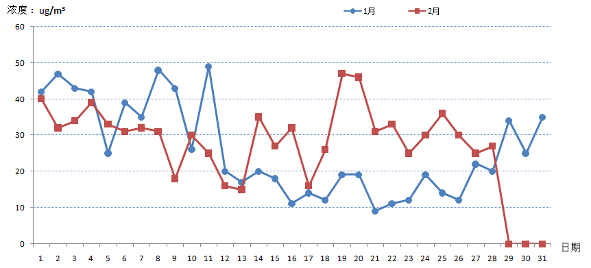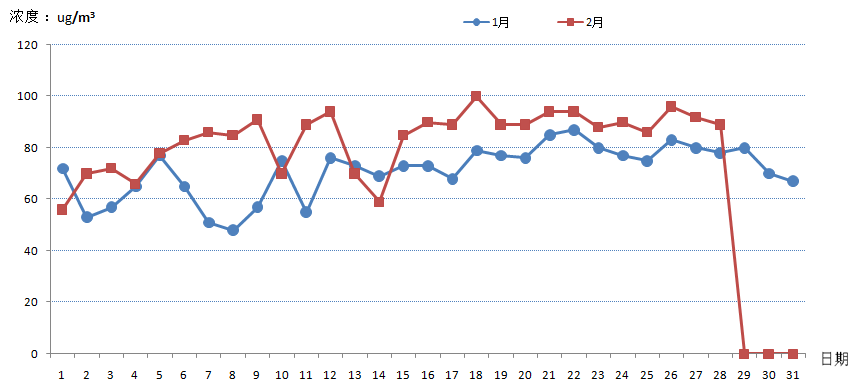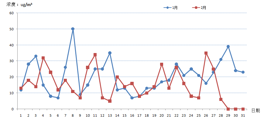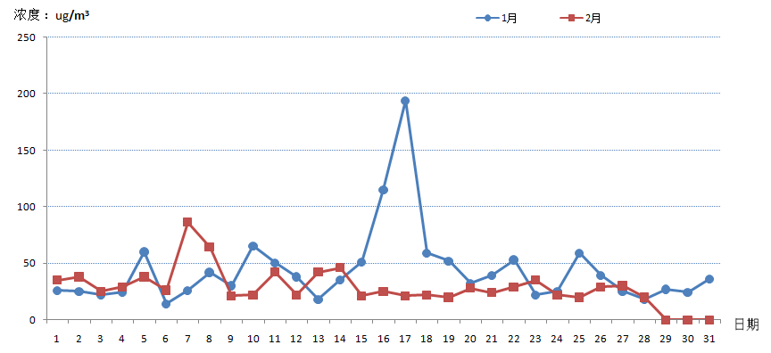 PM2.5日均值浓度范围为20ug/m3~86ug/m3,均值为32ug/m3。PM2.5共计1天日均值高于日均值浓度均低于《环境空气质量标准》(GB3095-2012)中二级浓度限值。其中,2月7日日均值为86ug/m3。