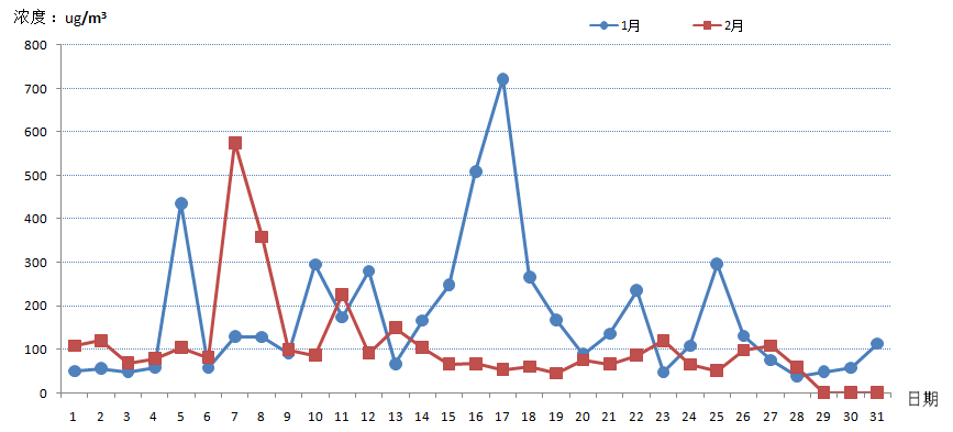 PM10日均值浓度范围为51ug/m3~575ug/m3,均值为117ug/m3。PM10共计4天日均值高于《环境空气质量标准》(GB3095-2012)中二级浓度限值,其中,2月7日日均值为575ug/m3;2月8日日均值为358ug/m3;2月11日日均值为226ug/m3;2月13日日均值为150ug/m3。