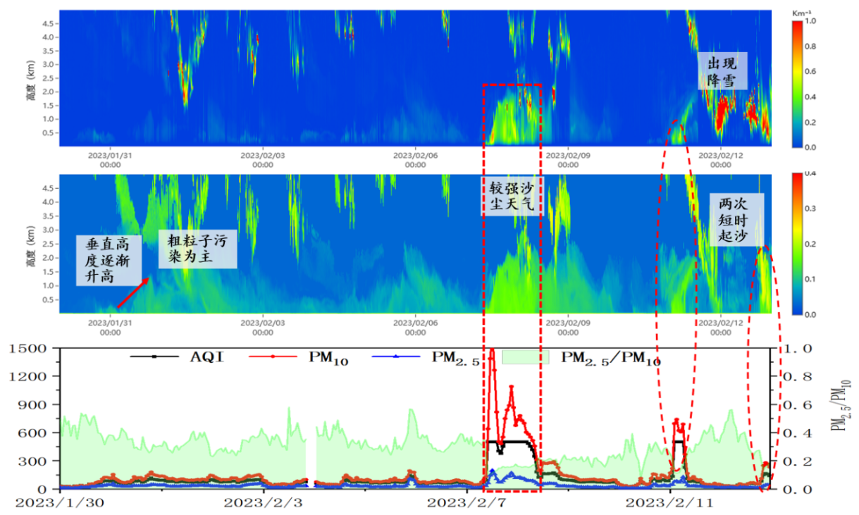 2月7日早间,嘉峪关出现较强沙尘天气,雷达消光系数与退偏振比同步升高,沙尘垂直影响高度达到2km,空气质量持续严重污染。8日下午至9日雷达退偏振比开始逐渐降低,沙尘强度减弱,沙尘持续消散。2月11日0时起出现短时沙尘输入,但沙尘很快向空中消散。随后高空冰云迅速降低,云底高度接近近地面并出现少量降雪。