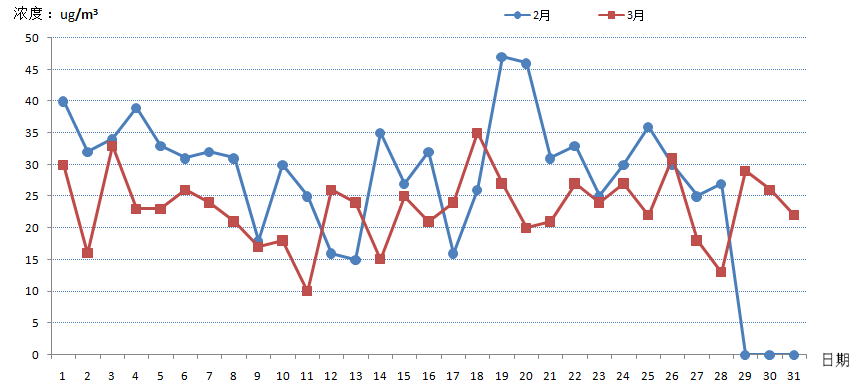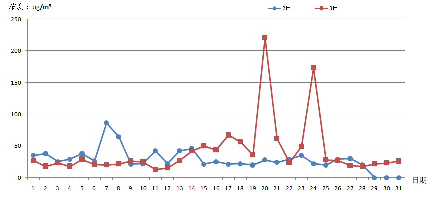 PM2.5日均值浓度范围为13ug/m3~162ug/m3,均值为45ug/m3。PM2.5共计5天日均值高于日均值浓度均低于《环境空气质量标准》(GB3095-2012)中二级浓度限值。其中,4月4日日均值为92ug/m3;4月9日日均值为92ug/m3;4月18日日均值为153ug/m3;4月19日日均值为162ug/m3;4月27日日均值为79ug/m3。