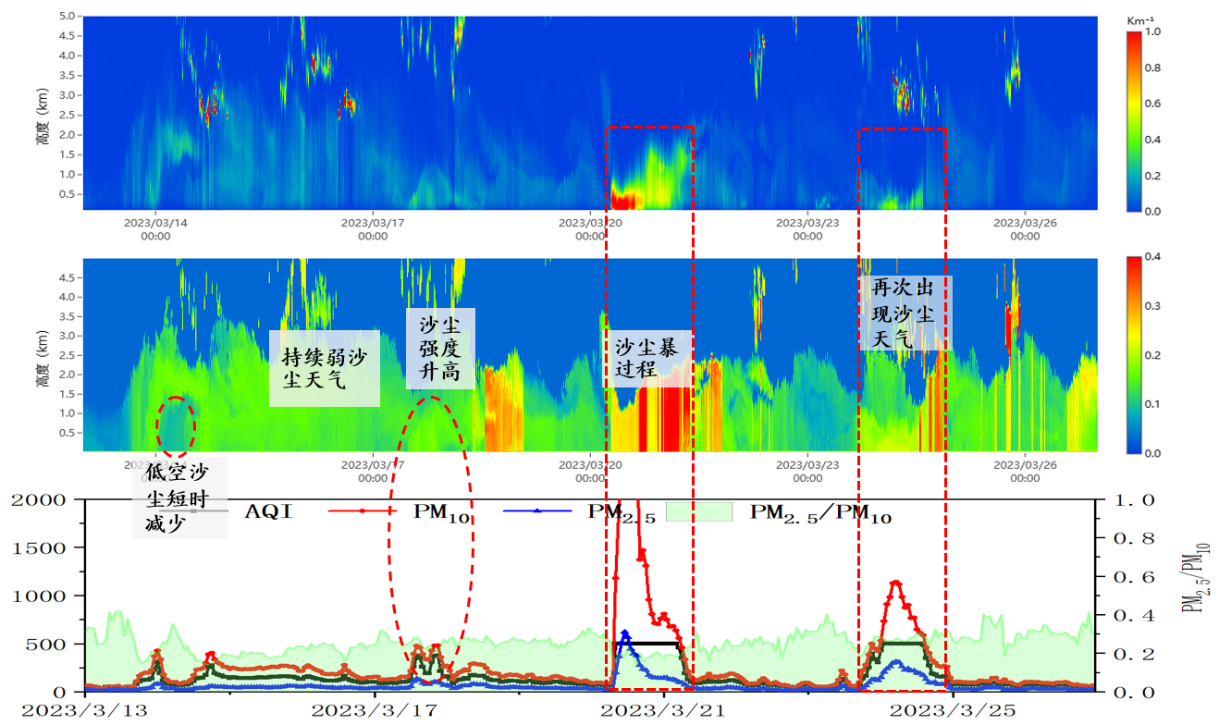 3月20日,嘉峪关出现沙尘暴过程,雷达消光系数和退偏振比急速升高,沙尘强度较高,空气质量持续严重污染;21日早间雷达消光系数显著降低,沙尘强度迅速减弱,至22日多数沙尘消散。3月23日下午,嘉峪关再次出现较强沙尘天气,沙尘强度较高,但略弱于20日的沙尘暴天气,垂直影响高度为1km左右,24日沙尘强度减弱的同时垂直高度升高,扩散条件略有好转。25-26日,沙尘残留逐渐消散,颗粒物污染略有减少。