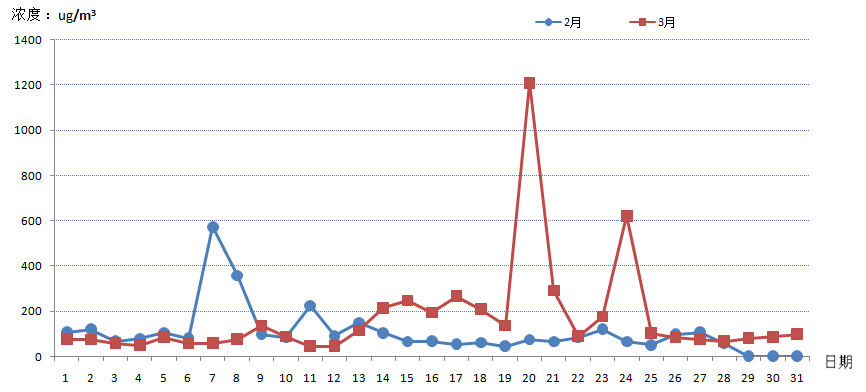 PM10日均值浓度范围为39ug/m3~1872ug/m3,均值为242ug/m3。PM10共计13天日均值高于《环境空气质量标准》(GB3095-2012)中二级浓度限值,其中,4月1日日均值为165ug/m3;4月3日日均值为300ug/m3;4月4日日均值为357ug/m3;4月5日日均值为172ug/m3;4月6日日均值为1179ug/m3;4月9日日均值为357ug/m3;4月12日日均值为202ug/m3;4月14日日均值为200ug/m3;4月18日日均值为636ug/m3;4月19日日均值为1872ug/m3;4月24日日均值为197ug/m3;4月25日日均值为171ug/m3;4月27日日均值为707ug/m3。