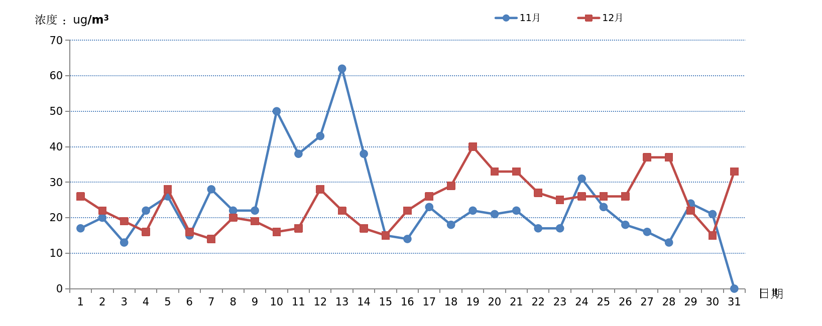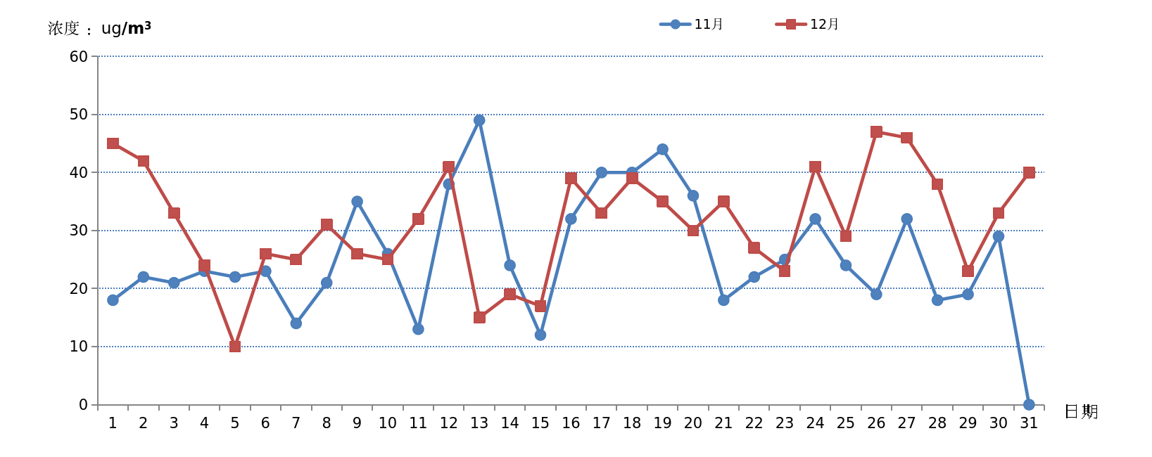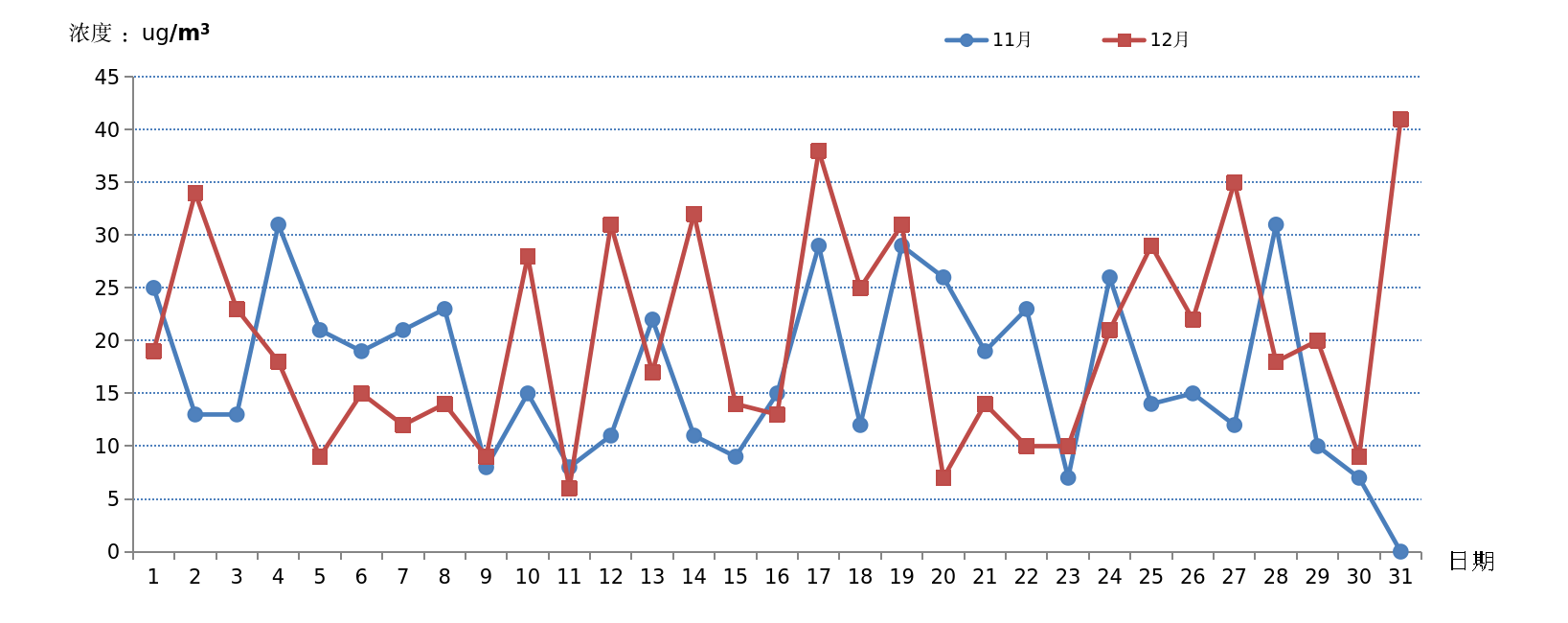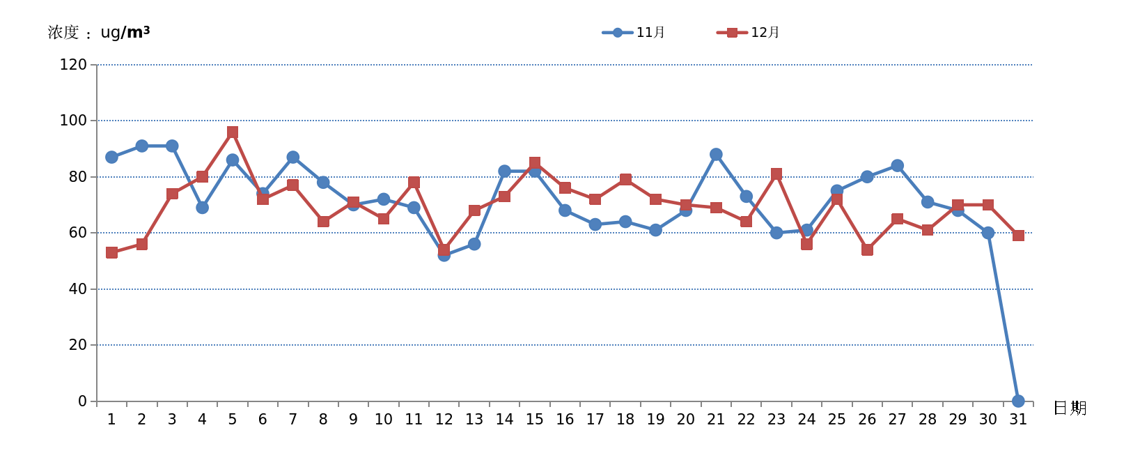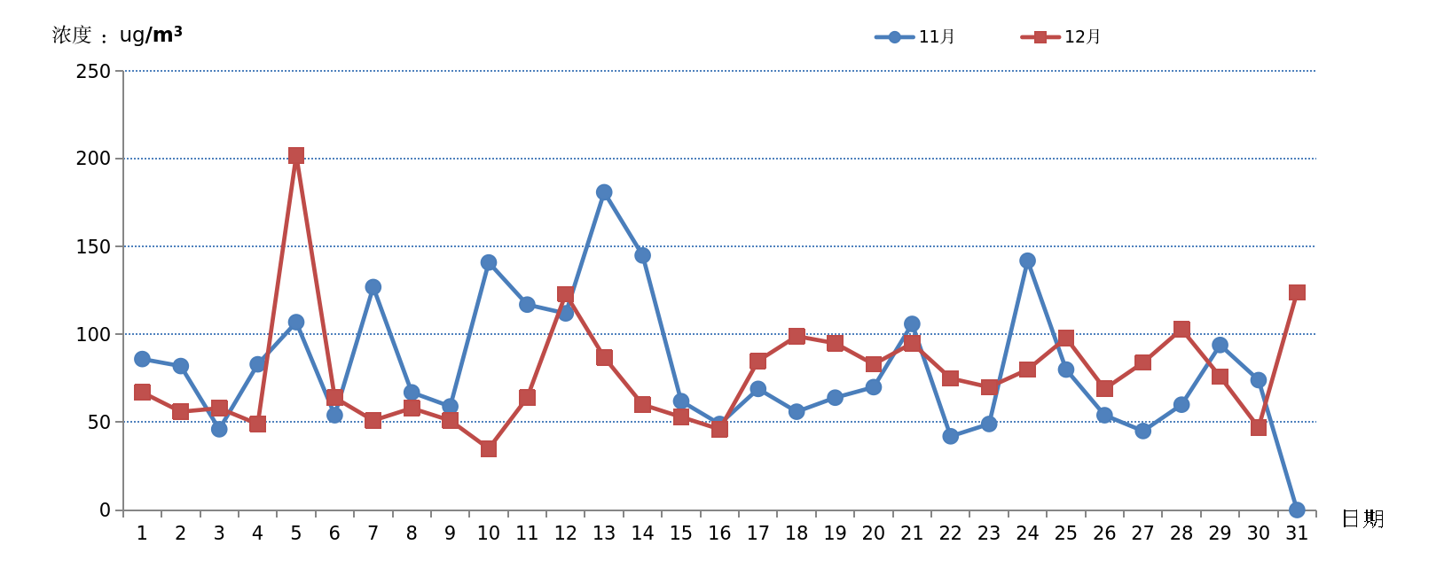 PM10日均值浓度范围为35ug/m3~202ug/m3,日均值为78ug/m3,日均值1天高于《环境空气质量标准》(GB3095-2012)中二级浓度限值,其中12月5日日均值为202ug/m3。