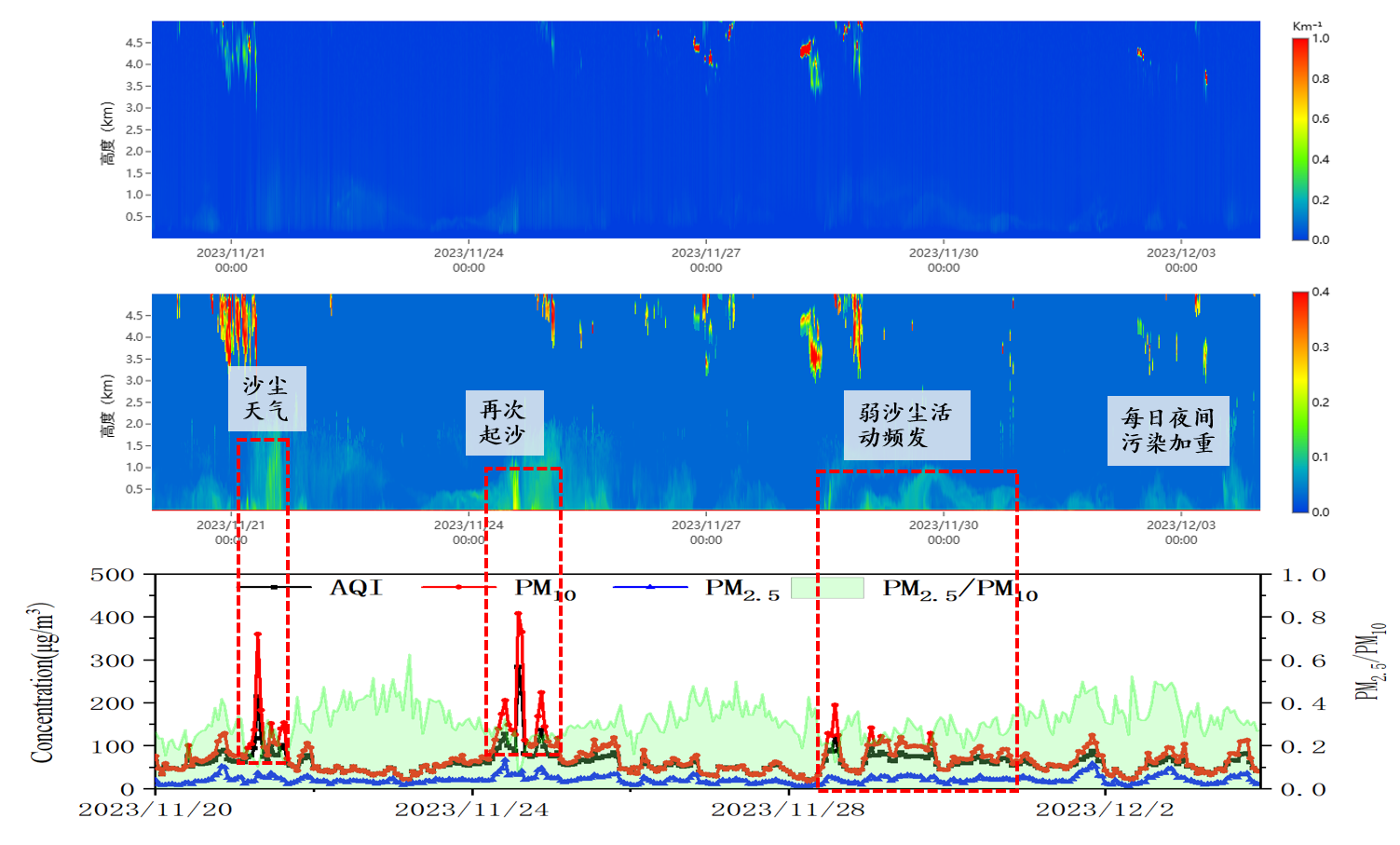 11月26日-27日,嘉峪关颗粒物污染较少,28日早间出现短时弱沙尘,雷达退偏振比短时升高。28日夜间,雷达退偏振比再次升高,出现弱沙尘传输,29日夜间低空沙尘减少,空气质量好转,逐渐沉降后30日早间影响到近地面,导致颗粒物污染小幅加重。12月1日-3日,每日夜间雷达退偏振比小幅升高,颗粒物污染呈小幅加重趋势。