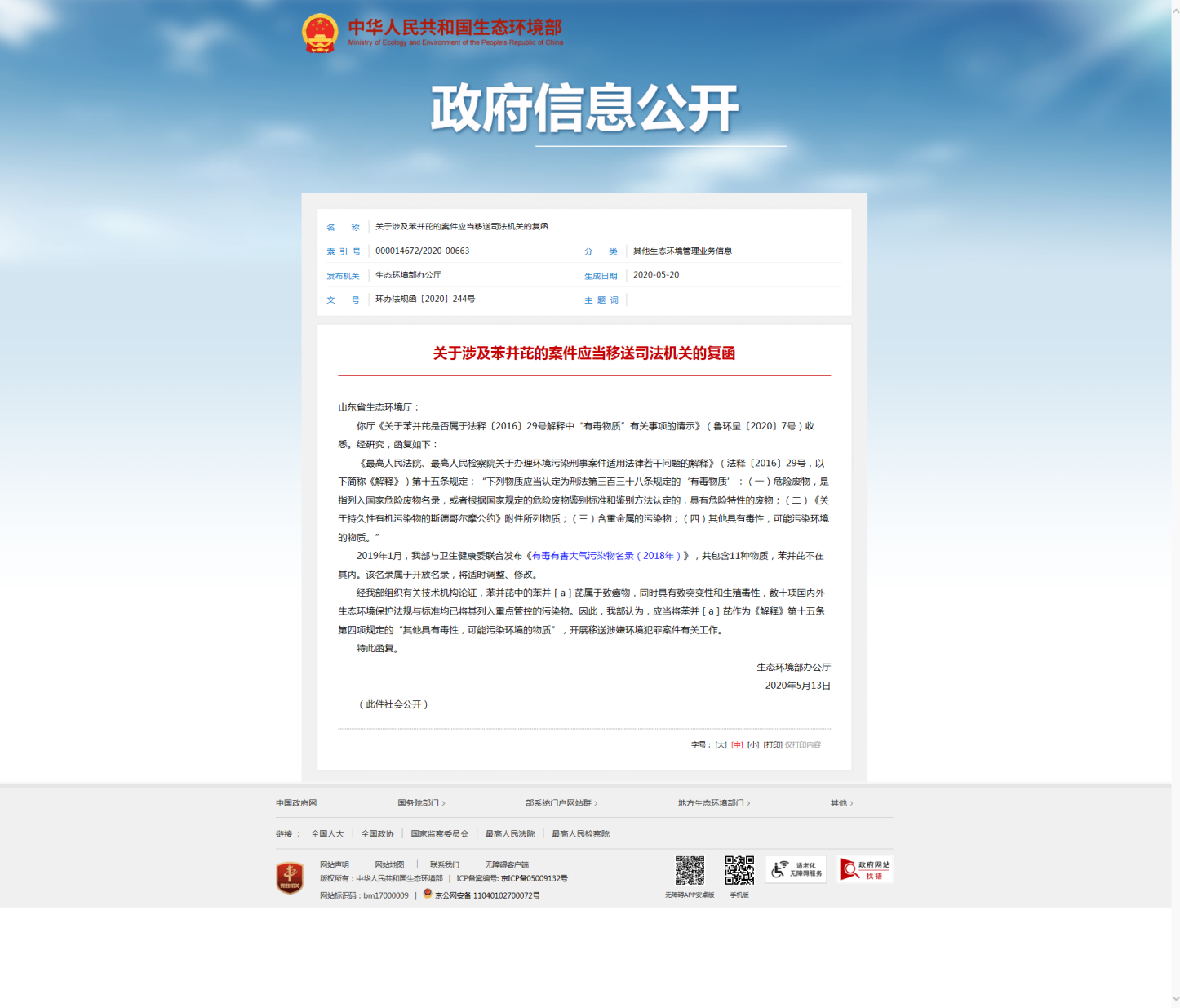 关于涉及苯并芘的案件应当移送司法机关的复函