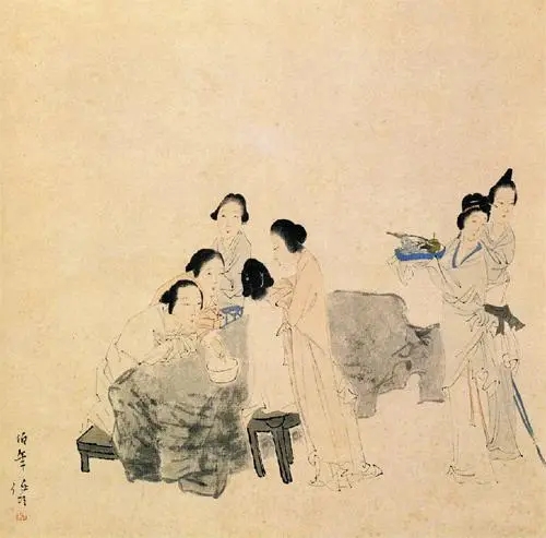 在故宫博物院,收藏着一幅名为《乞巧图轴》的古代人物绘画作品,其作者是著名的清末海派画家任伯年。图中描绘了农历七月初七这一天,一群青年女子在月夜下围聚石案周围,用一枚绣针投入一只水碗中,以此进行“卜巧”“乞巧”等民俗活动。
