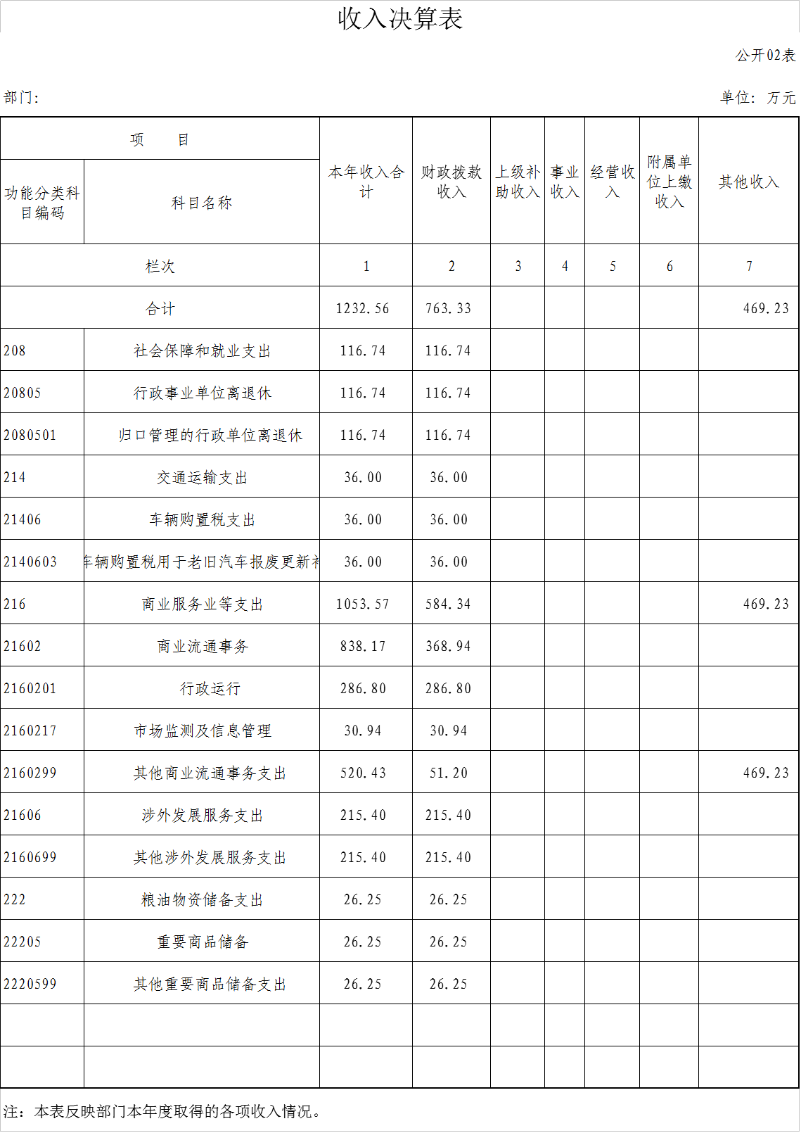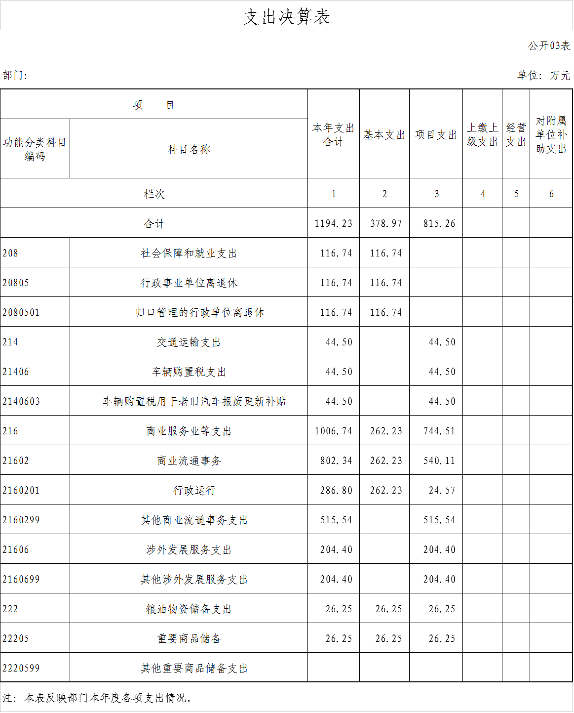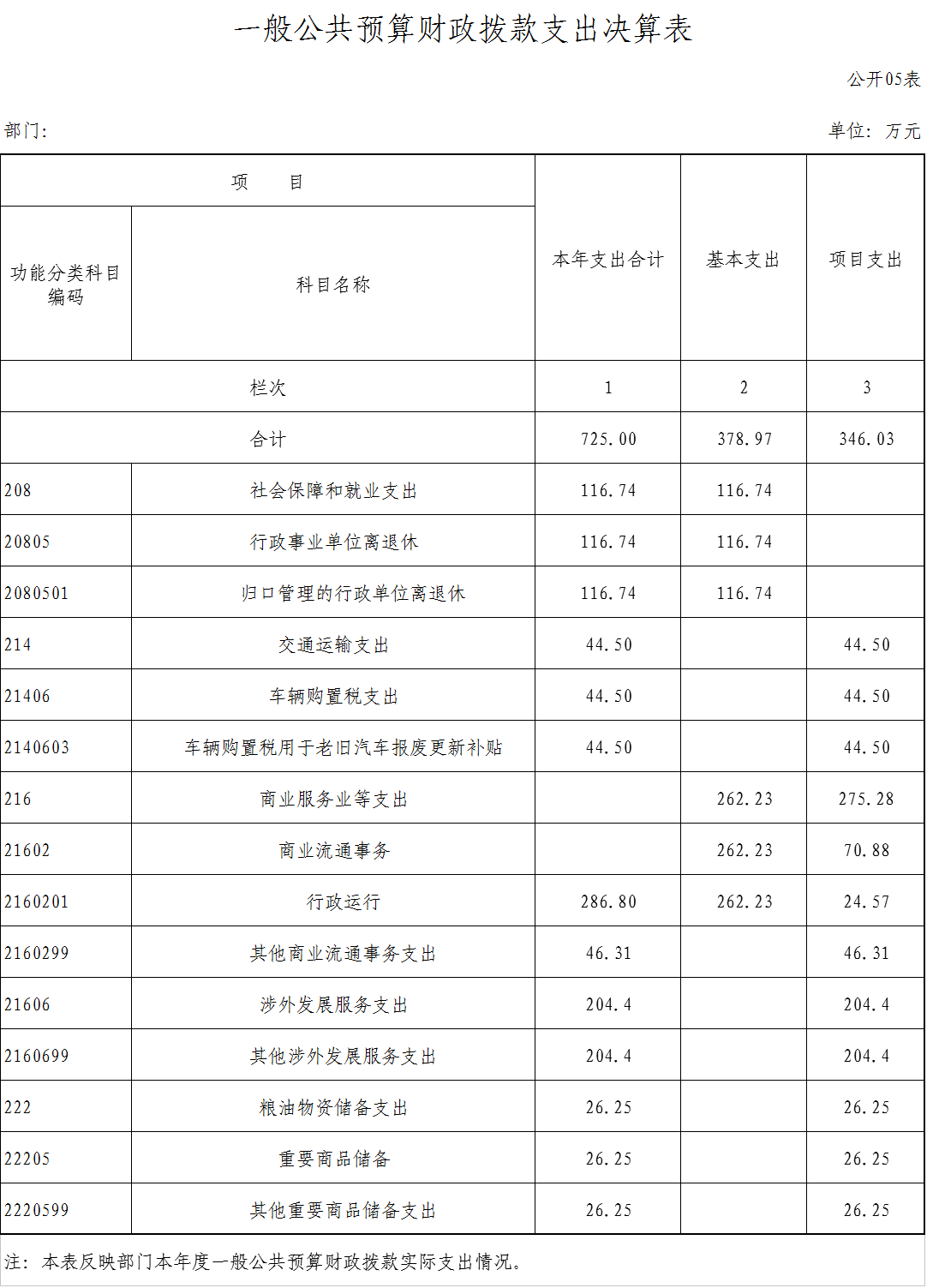 社会保障和就业支出-行政事业单位离退休-归口管理的行政单位离退休支出116.74万元,占16.10%;交通运输支出-车辆购置税支出-车辆购置税用于老旧汽车报废更新补贴支出44.50万元,占10.47%;商业服务业等支出-商业流通事务-行政运行支出286.80万元,占39.56%;商业服务业等支出-商业流通事务-其他商业流通事务支出46.31万元,占6.39%;商业服务业等支出-涉外发展服务支出-其他涉外发展服务支出204.40万元,占28.19%;粮油物资储备支出-重要商品储备-其他重要商品储备支出26.25万元,占3.62%。