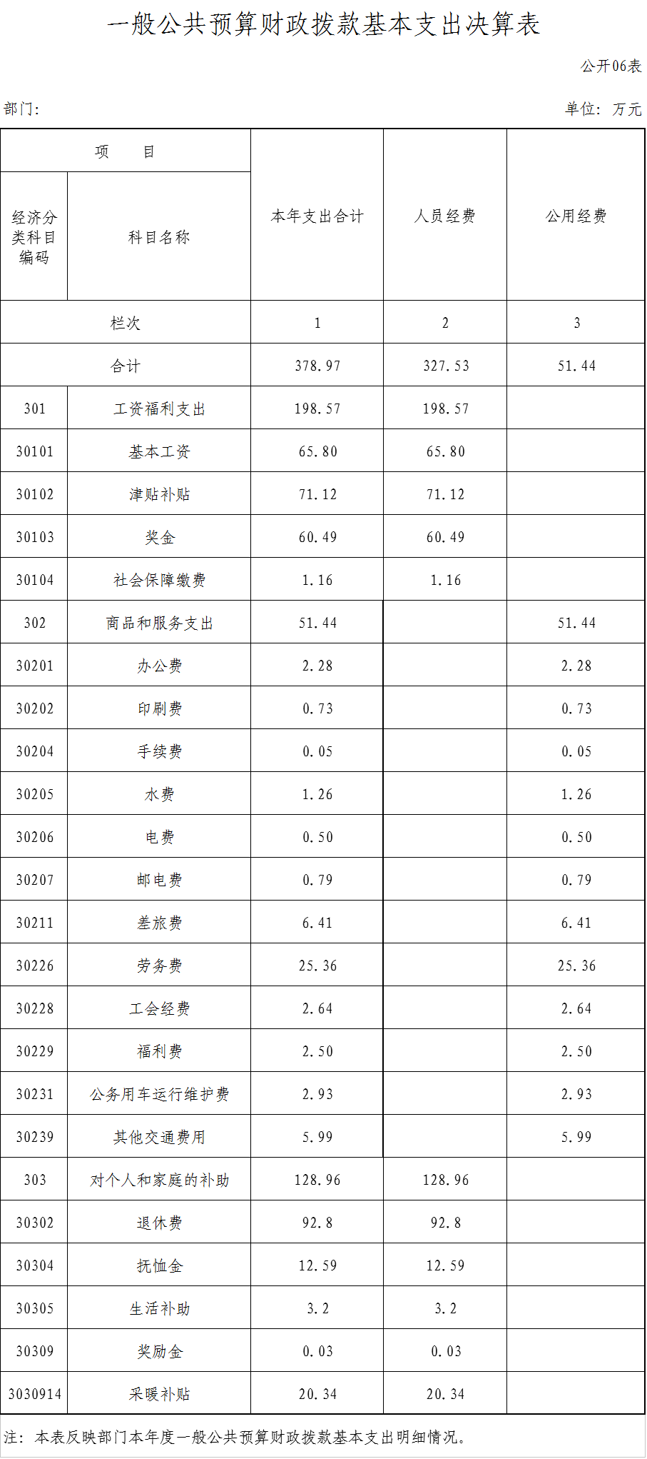 嘉峪关市商务局2016年度一般公共预算财政拨款基本支出378.97万元,其中:人员经费327.53万元,主要包括基本工资、津贴补贴、奖金、其他社会保障缴费、其他工资福利支出、退休费、抚恤金、奖励金、生活补助、采暖补贴等;公用经费51.44万元,主要包括办公费、水电费、邮电费、差旅费、劳务费、工会经费、福利费、公务用车运行维护费、其他交通费用等。