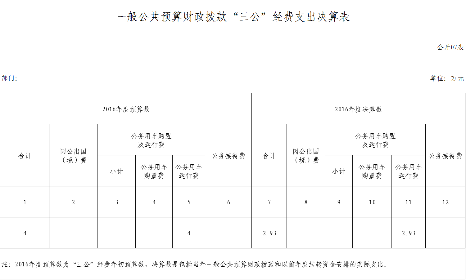 2016年一般公共预算财政拨款“三公”经费支出比上2015年减少2.18万元,下降42.66%,其中:公务用车运行维护费支出比上年减少2.18万元,下降42.66%,主要原因是贯彻落实中央和国家机关公车制度改革精神,公务用车停驰并予以封存。
