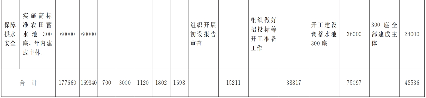 实施农村“水盆子”建设工程900个,具体为建设水库10座、新建淤地坝40座、建设高标准农田蓄水池300座(省农业农村厅负责实施)、建设小微型调蓄设施550座。