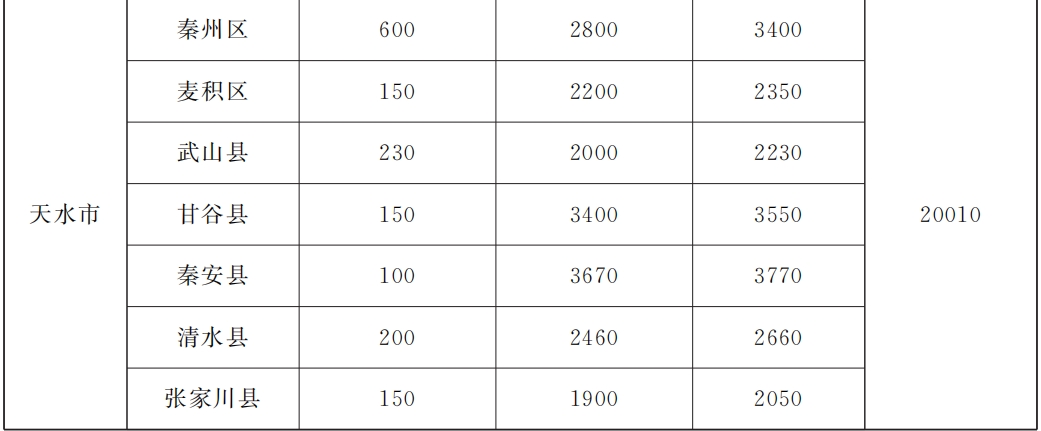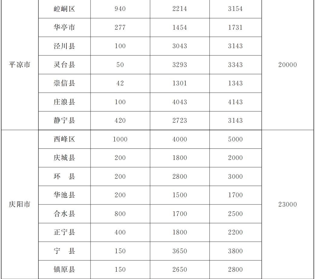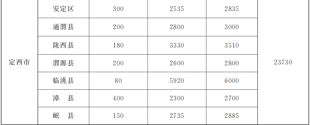2024年,全省实现城镇新增就业30万人,其中,兰州市7万人、嘉峪关市0.6万人、金昌市0.9万人、酒泉市1.3万人、张掖市1.9万人、武威市1.7万人、白银市2.4万人、天水市3.9万人、平凉市2.4万人、庆阳市2.4万人、定西市1.6万人、陇南市1.4万人、临夏州1.7万人、甘南州0.4万人、兰州新区0.4万人。