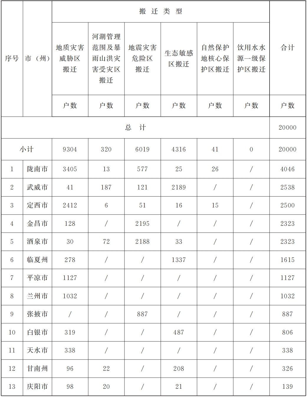 2024年全省计划搬迁2万户6.4万人,鼓励先行先干,资金据实结算。按类型分:地质灾害威胁区9304户、河湖管理范围及暴雨山洪灾害受灾区320户、地震灾害危险区6019户、生态敏感区4316户、自然保护地核心保护区41户;按市(州)分:陇南市4046户、武威市2538户、定西市2500户、金昌市2323户、酒泉市2323户、临夏州1615户、平凉市1127户、兰州市1032户、张掖市887户、白银市806户、天水市338户、甘南州326户、庆阳市139户(见表)。