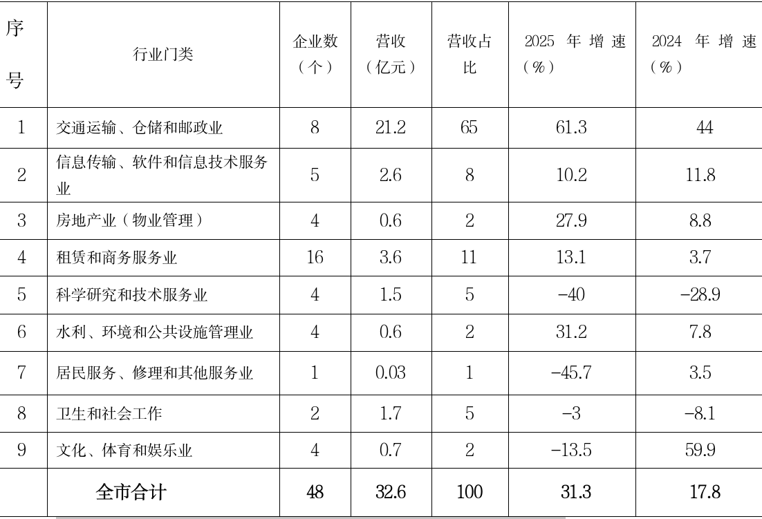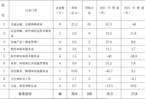 行业发展极不平衡。目前全市规上服务业企业实现营业收入仍然主要集中在交通运输、仓储和邮政业、信息传输、软件与信息技术服务业、租赁和商务服务业、科学研究与技术服务业、卫生和社会工作5个行业,1-5月5个行业实现营业收入30.7亿元,占全部规上服务业营业收入的94.1%。其他物业管理、水利、环境和公共设施管理业、居民服务、修理和其他服务业、文化、体育和娱乐业4个行业实现营业收入1.8亿元,仅占全部规上服务业营业收入的5.9%。