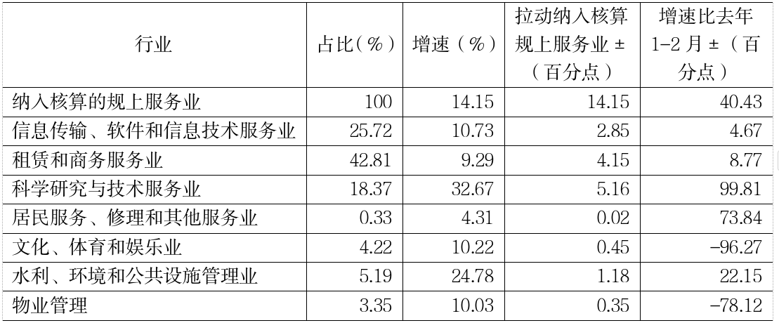 (二)纳入核算行业平稳增长。1-2月,全市纳入GDP核算的规上服务业企业(37户)实现营业收入3.49亿元,同比增长14.15%。
