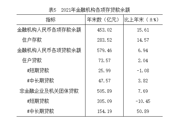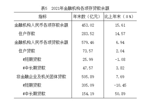 金融:年末全市金融机构人民币各项存款余额453.02亿元,比上年末增长15.61%;住户存款283.52亿元,比上年末增长14.57%;其中,活期存款84.37亿元,比上年末增长15.89%,定期及其他存款199.16亿元,比上年末增长14.01%。金融机构人民币各项贷款余额579.46亿元,比上年末增长6.94%;住户贷款73.57亿元,比上年末增长2.04%,其中短期贷款25.99亿元,比上年末下降1.08%,中长期贷款47.57亿元,比上年末增长3.82%。