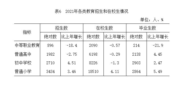 教育:中等职业教育招生896人,下降18.4%;普通高中招生1982人,下降2.75%;初中学校招生2710人,增长4.51%;普通小学招生3434人,增长3.46%;特殊教育招生9人,在校66人;幼儿园在园幼儿12803人,学前3年毛入园率98.5%。