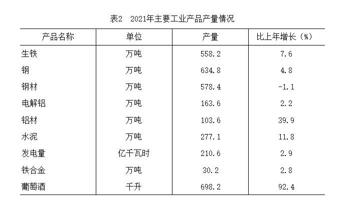 规模以上工业增加值中,轻工业增加值增长14.9%,重工业增加值增长5.6%。九种主要工业产品产量“八升一降”。葡萄酒产量698.2千升,增长92.4%,铝材产量103.6万吨,增长39.9%,水泥产量277.1万吨,增长11.8%,生铁产量558.2万吨,增长7.6%,钢产量634.8万吨,增长4.8%,发电量210.6亿千瓦时,增长2.9%,铁合金产量30.2万吨,增长2.8%,电解铝产量163.6万吨,增长2.2%;钢材产量578.4万吨,下降1.1%。