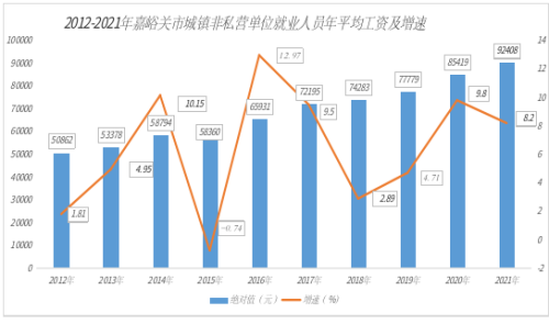 2021年嘉峪关市城镇非私营单位就业人员年平均工资92408元,比上年增加6989元,与上年同期相比名义增长8.2%。扣除物价因素,2021年嘉峪关市城镇非私营单位就业人员年平均工资增长6.8%。
