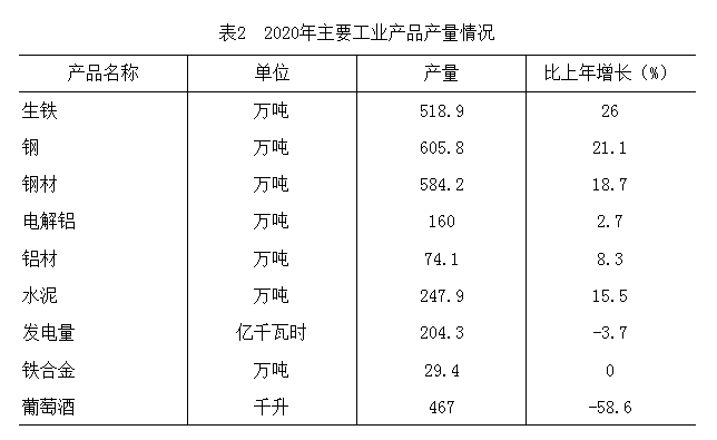 九种主要工业产品产量“六升两降一平”。生铁产量518.9万吨,增长26%,钢产量605.8万吨,增长21.1%,钢材产量584.2万吨,增长18.7%,水泥产量247.9万吨,增长15.5%,铝材产量74.1万吨,增长8.3%,电解铝产量160万吨,增长2.7%;葡萄酒产量467千升,下降58.6%,发电量204.3亿千瓦时,下降3.7%;铁合金产量29.4万吨,与去年同期持平。