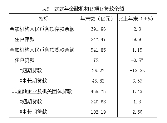 金融:年末全市金融机构人民币各项存款余额391.86亿元,比上年末增长2.3%;住户存款247.47亿元,比上年末增长19.91%;其中,活期存款72.8亿元,比上年末增长19.63%,定期及其他存款174.68亿元,比上年末增长20.03%。金融机构人民币各项贷款余额541.85亿元,比上年末增长1.15%;住户贷款72.1亿元,比上年末下降0.57%,其中短期贷款26.27亿元,比上年末下降13.36%,中长期贷款45.82亿元,比上年末增长8.63%。