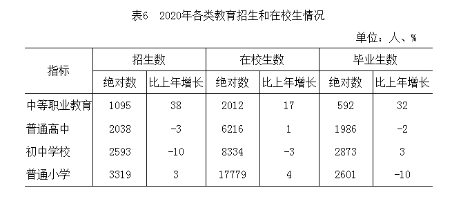 教育:中等职业教育招生1095人,增长38%;普通高中招生2038人,下降3%;初中学校招生2593人,下降10%;普通小学招生3319人,增长3%;特殊教育招生12人,在校66人;幼儿园在园幼儿11779人,学前3年毛入园率98.5%。