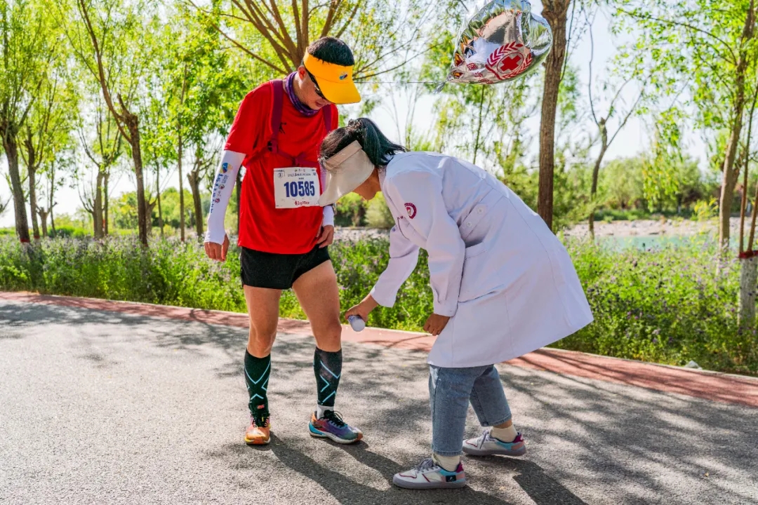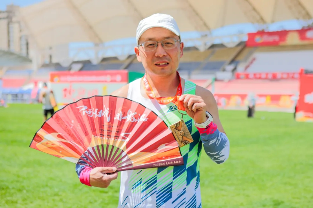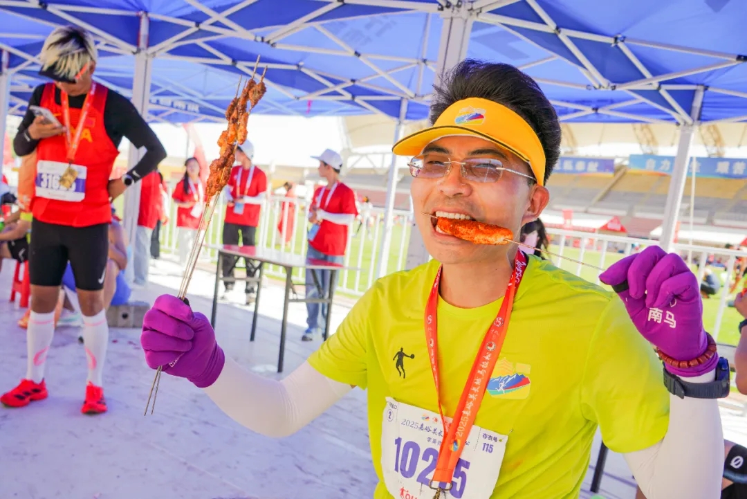赛事组委会以事无巨细的周全考量,为每一位勇士的征程铺设坦途。赛道沿线补给点规划严谨,能量胶、矿泉水、运动饮料等专业补给供应充足,让跑者每一步安心无虞。专业医疗团队严阵以待,以医者仁心全程护航,为跑者的生命安全构筑起坚实屏障。冲线之后,主会场早已备好嘉峪关驰名中外的特色烤肉。明火炙烤的羊肉瞬间慰藉了征尘仆仆的勇士;钢铁铸就的“捷报频传”奖牌,更是“钢城”献给每一位征服者的无上勋章。以折扇为载体的“关照”,则成为勇者征战雄关的“独家记忆”。