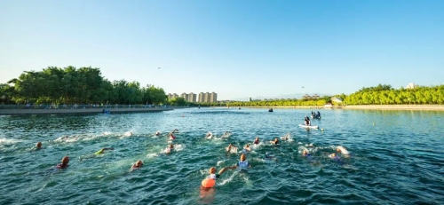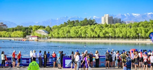 7月15日,第一届全国学生(青年)运动会(公开组)铁人三项资格赛-嘉峪关站在东湖湖畔拉开序幕,碧水蓝天,映着远处的祁连雪山,西北地区独特的自然风光尽收眼底。清晨六点,赛场准备就绪,伴随着具有西北特色的演出,赛场氛围逐渐热烈。