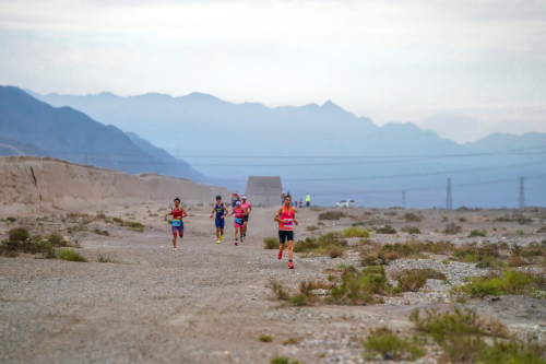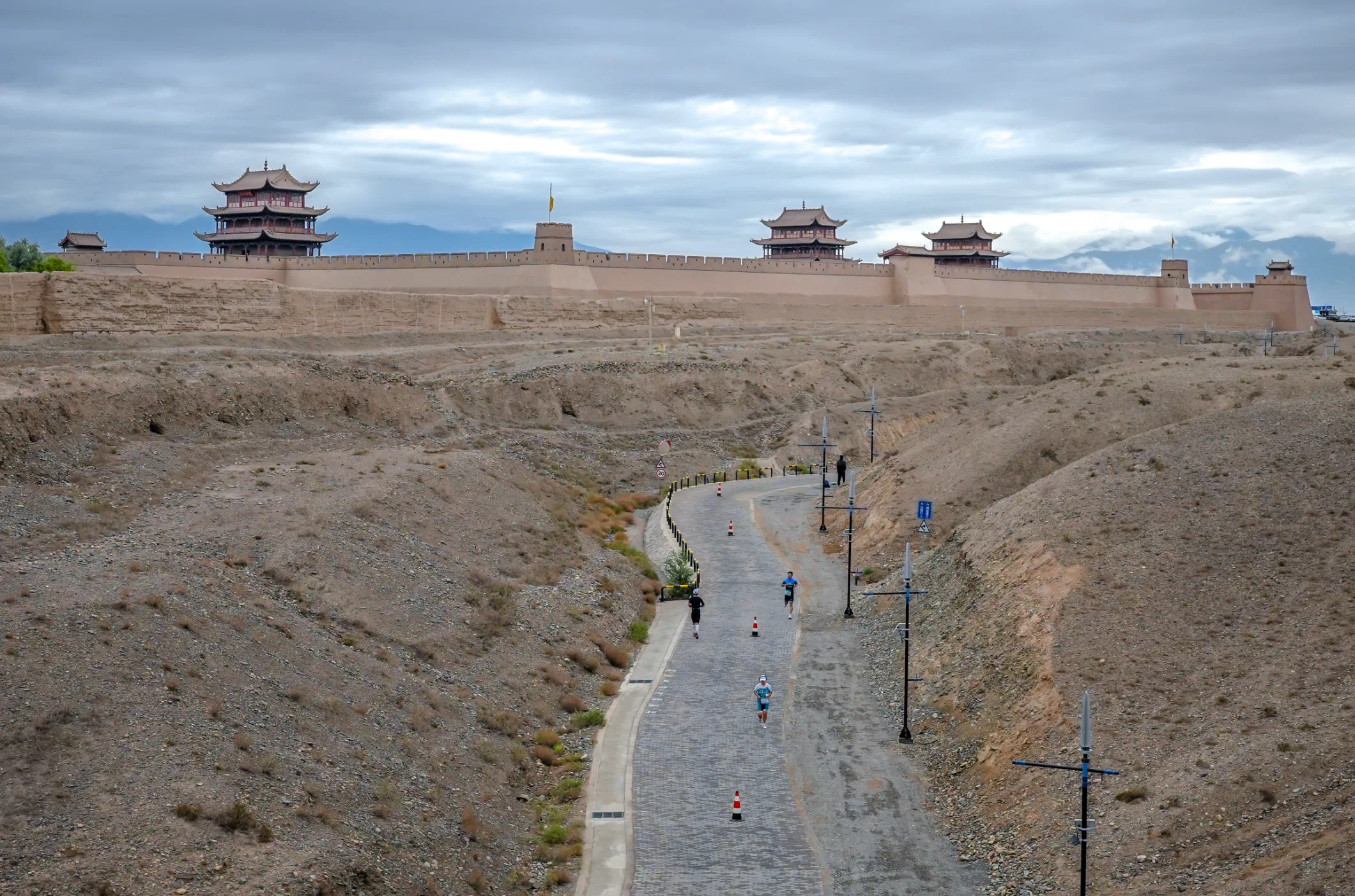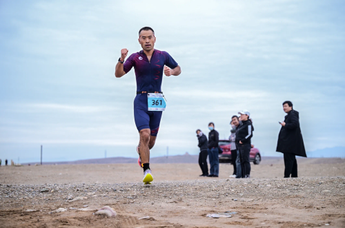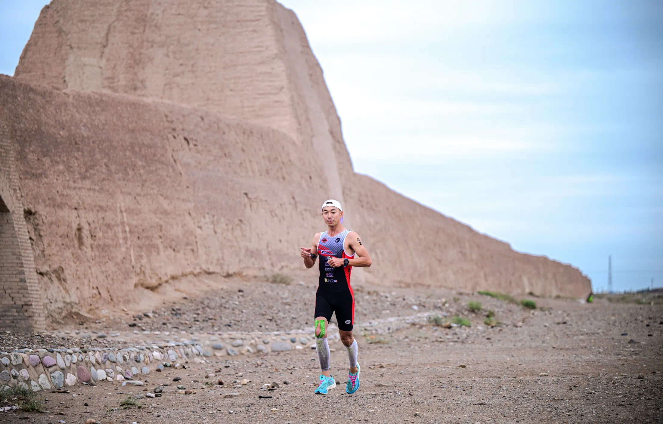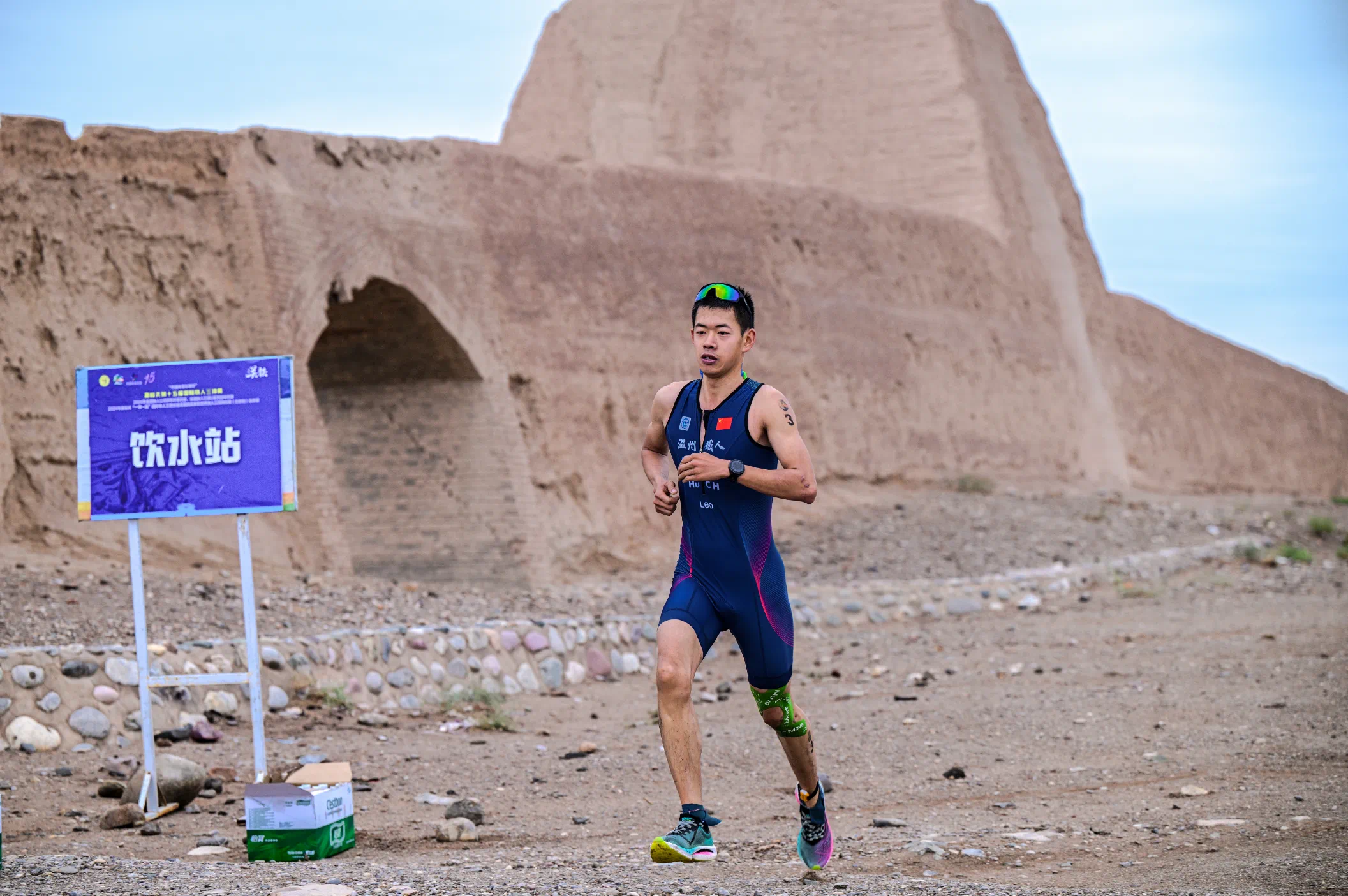 骑行赛段的结束将运动员们带入关城赛场,运动员们在戈壁上开始了最后的跑步赛段的冲刺。15公里的跑步赛程中,他们或快或慢,但每一步都显得异常坚定,用实际行动诠释了“铁人”二字的真正含义。路途两旁的身穿铁甲的关城“士兵”为“铁人”们的坚韧与拼搏摇旗呐喊,它们与运动员们的拼搏精神交相辉映,共同书写了一段关于勇气、坚持与荣耀的传奇。