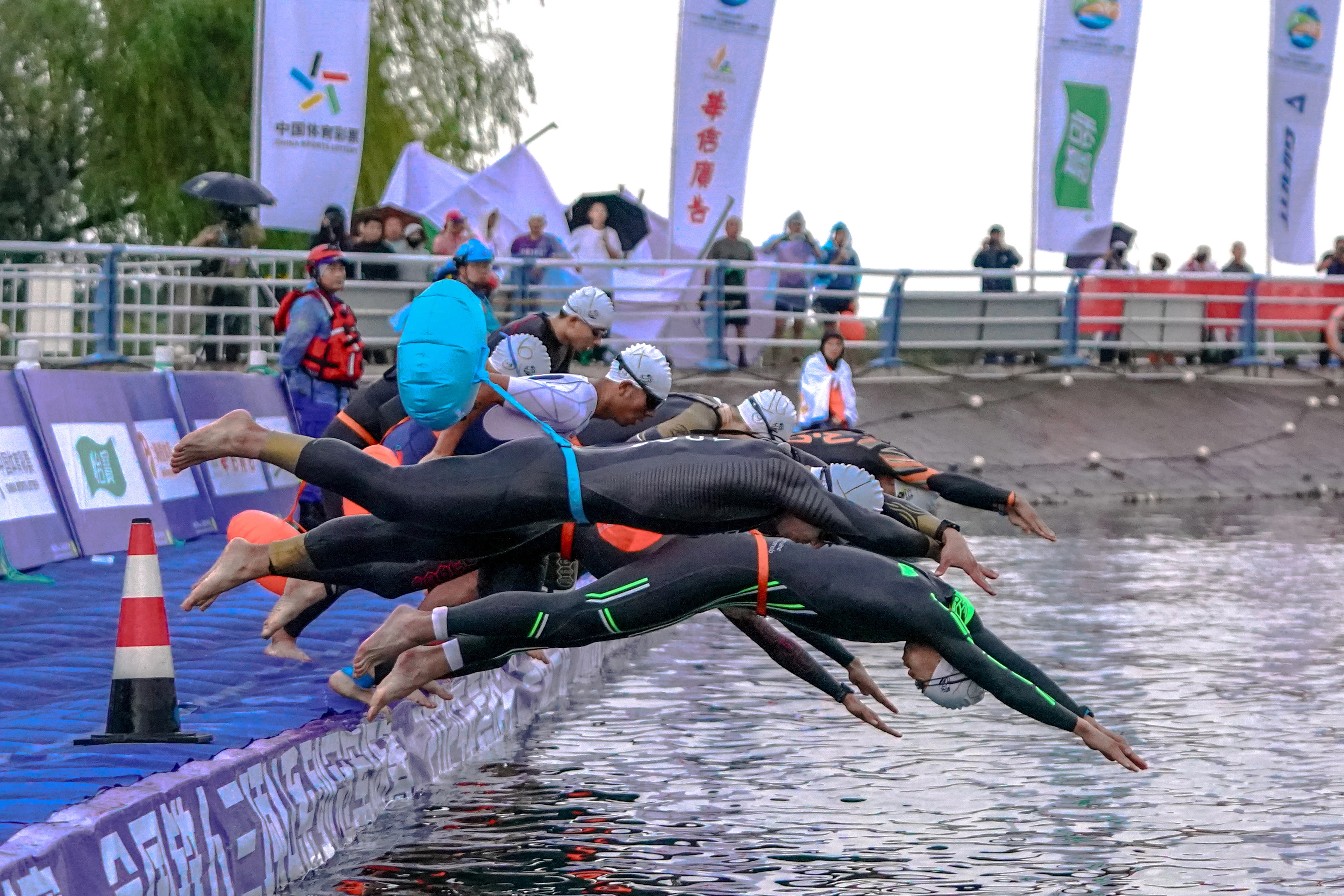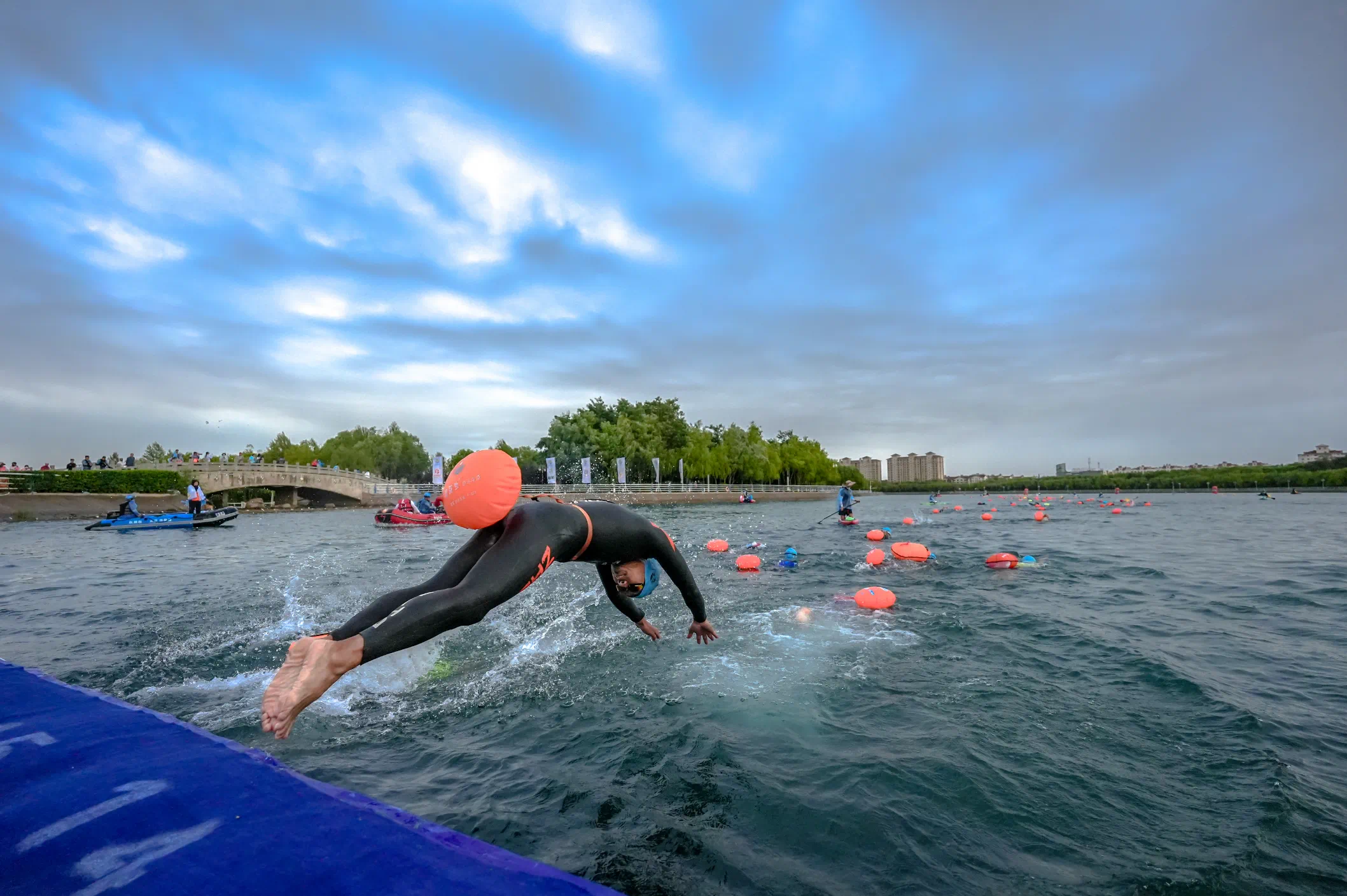 7时整,随着一声清脆的发令枪响,长城戈壁精英组、全程分龄组、团体接力组的运动员们无惧寒冷,接连“跃”入东湖,开始了游泳赛段的较量。湖中身姿矫健,勇往无前。