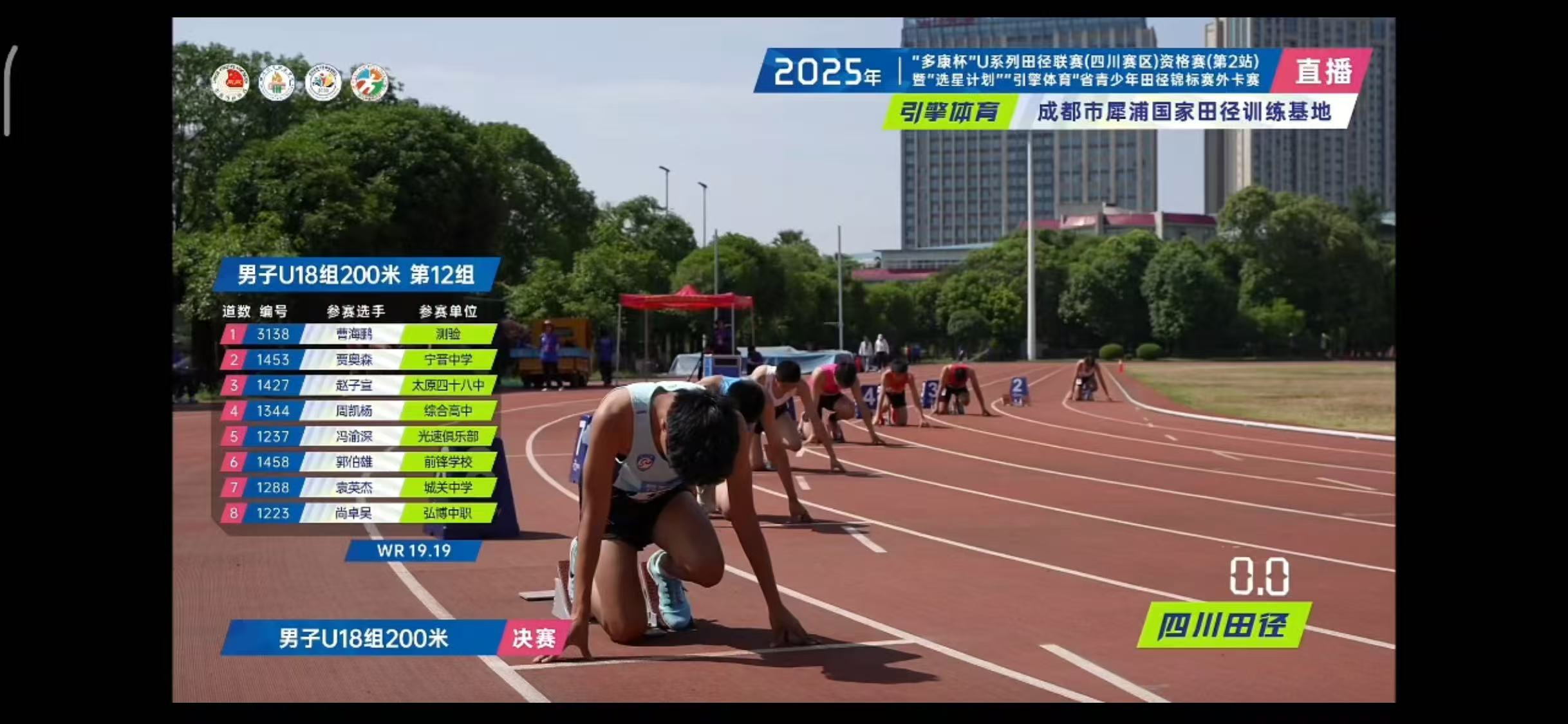5月24日-25日,成都“多康杯”U系列田径联赛资格赛上,市体校田径队4名“追风少年”火力全开:杜一池200米跑出22″99的优异成绩;曹海鹏、李泽东、李博伦分别在各自项目中全力冲刺,刷新个人纪录,充分展现了学校上年度的冬训成果。