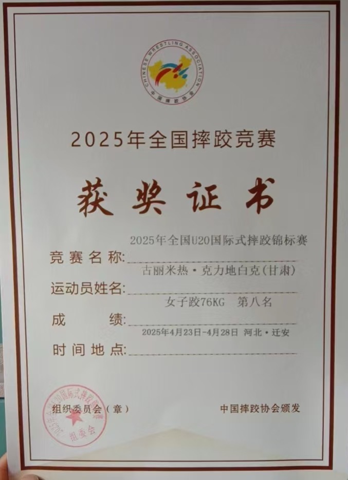 4月23日至28日,全国U20国际式摔跤锦标赛在河北迁安举行。古丽米热・克力地白克代表甘肃队出征,在女子跤76kg级别比赛中直面强敌,以精湛的技战术水平斩获第八名,达运动员转正标准,这一成绩创学校年度最佳,更让甘肃摔跤的荣光闪耀全国。
