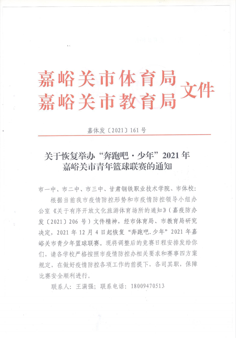 【通知公告】关于恢复举办“奔跑吧·少年”2021年嘉峪关市青少年篮球联赛的通知