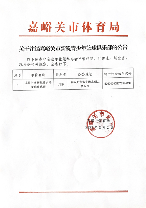 关于注销嘉峪关市新锐青少年篮球俱乐部的公告