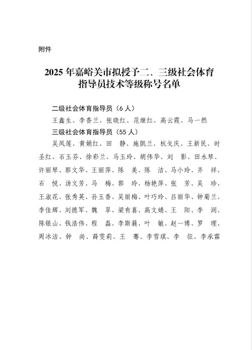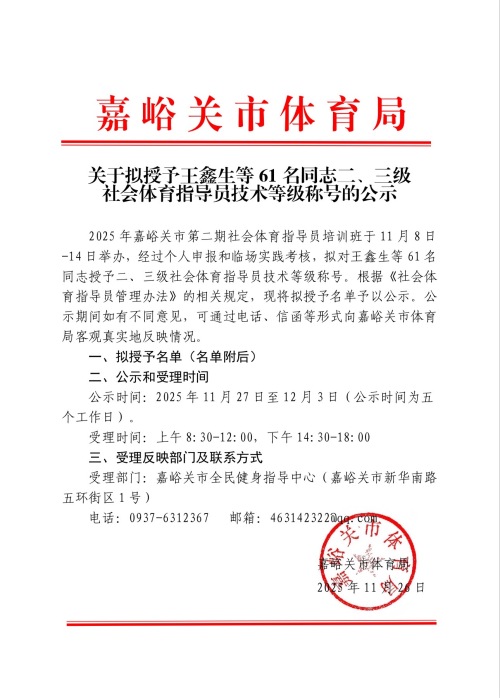 关于拟授予王鑫生等61名同志二、三级社会体育指导员技术等级称号的公示