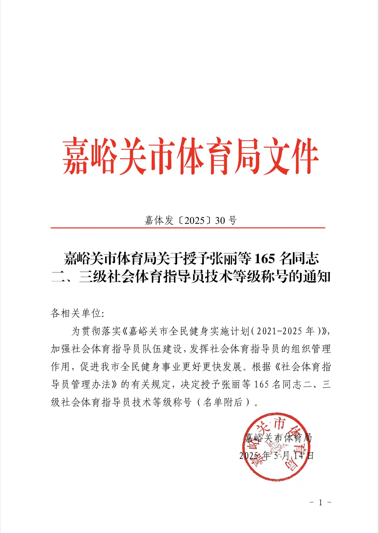 嘉峪关市体育局关于授予张丽等165名同志二、三级社会体育指导员技术等级称号的通知