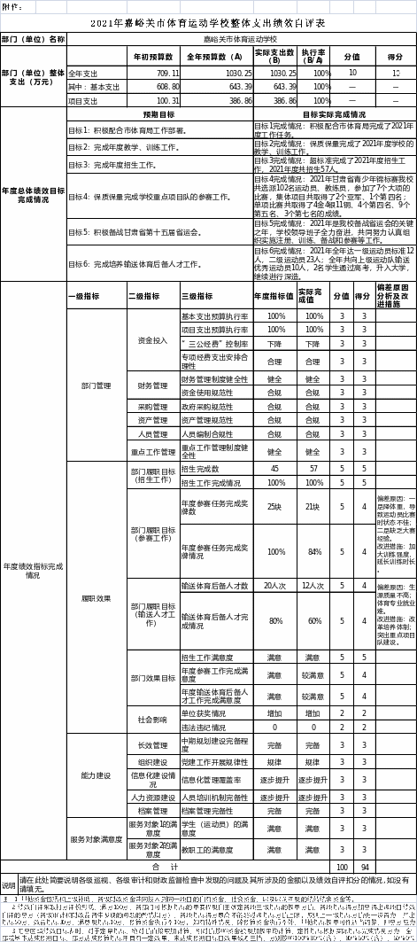 部门整体绩效目标完成情况:一是推动落实了中等体育运动学校补助政策,减轻了享受补助政策的运动员、教练员家庭的经济负担,使运动员、教练员保持了最佳的竞技状态;二是学校的教学(训练)环境得到了改善,办学条件更加优化;三是按时足额地保障了体校外聘教师(教练员)五项社会保险的缴纳及工资的发放,使其有了最基本的生活保障,保证了学校教学(训练)工作的正常运转;四是完成了2021年度甘肃省青少年锦标赛的参赛任务,更好地推动了全市竞技体育的开展。