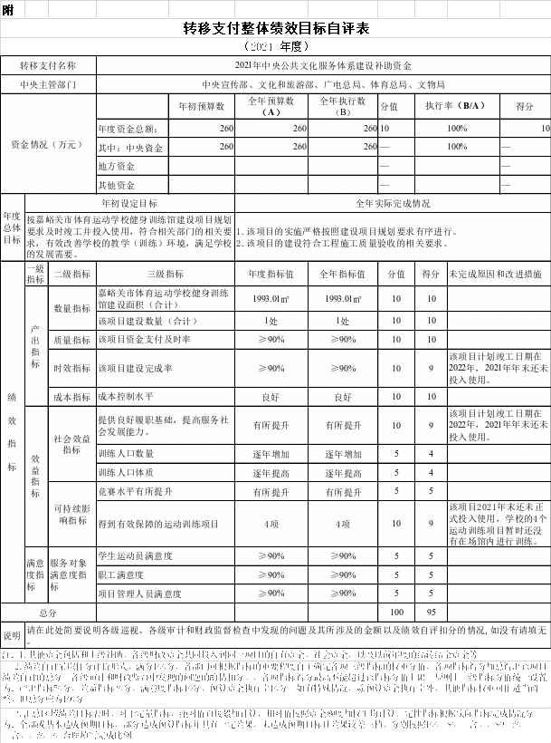 5.体校健身训练馆建设经费项目绩效自评情况:根据年初设定的绩效目标,体校健身训练馆建设经费自评得分95分,项目全年预算数为260万元,执行数为260万元,完成预算的100%;项目绩效目标完成情况:一是该项目严格按照嘉峪关市体育运动学校健身训练馆建设项目规划要求及时竣工并投入使用。二是该项目的建设完全符合工程施工质量验收的相关部门的相关要求。三是有效改善学校的办学条件,改善学校的教学(训练)环境,满足学校的发展需要。四是学校各项目运动队的竞赛水平稳步提升。下一步改进措施:一是各项目事前编制详细的预算清单,由校务会研究决定预算中的内容,并进行全面审核;二是严格执行各项采购制度,严格执行项目合同制;三是严格加强施工现场管理;四是各项目完工后,组织相关人员进行验收。