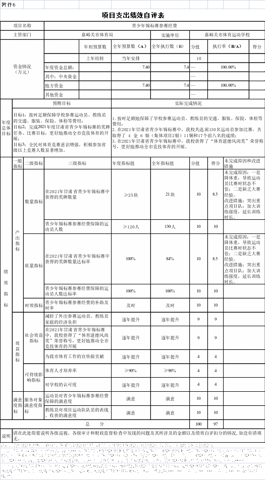 6.2021年甘肃省青少年锦标赛参赛经费项目绩效自评情况:根据年初设定的绩效目标,2021年甘肃省青少年锦标赛参赛经费自评得分,项目全年预算数为7.40万元,执行数为7.40万元,完成预算的100%;项目绩效目标完成情况:一是按时足额保障学校参赛运动员、教练员的交通、服装、保险、体检等费用;二是完成2021年度甘肃省青少年锦标赛的奖牌任务、比赛目标,更好地推动全市竞技体育的开展;三是全民对体育竞赛意识增强,积极参加省级以上竞赛人数显著增加。下一步改进措施:一是突出重点项目队;二是加大训练强度,延长训练时长。