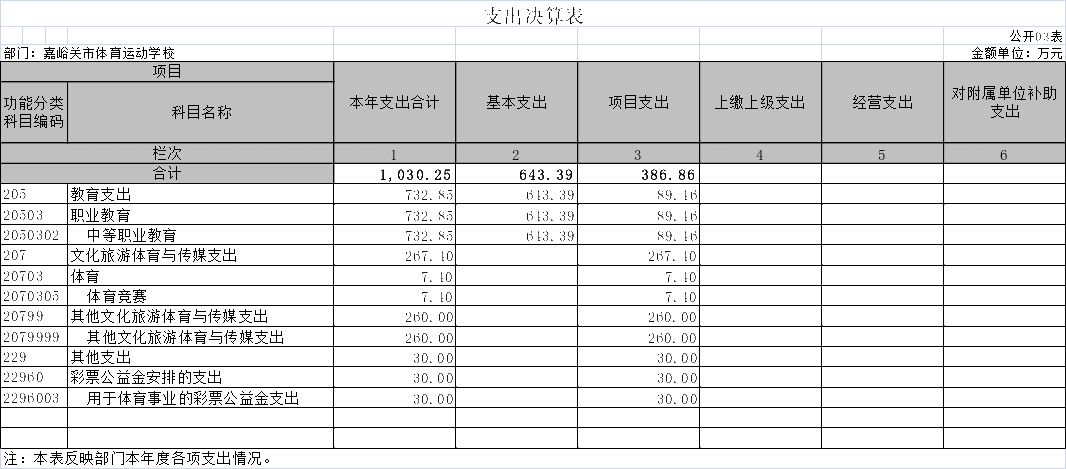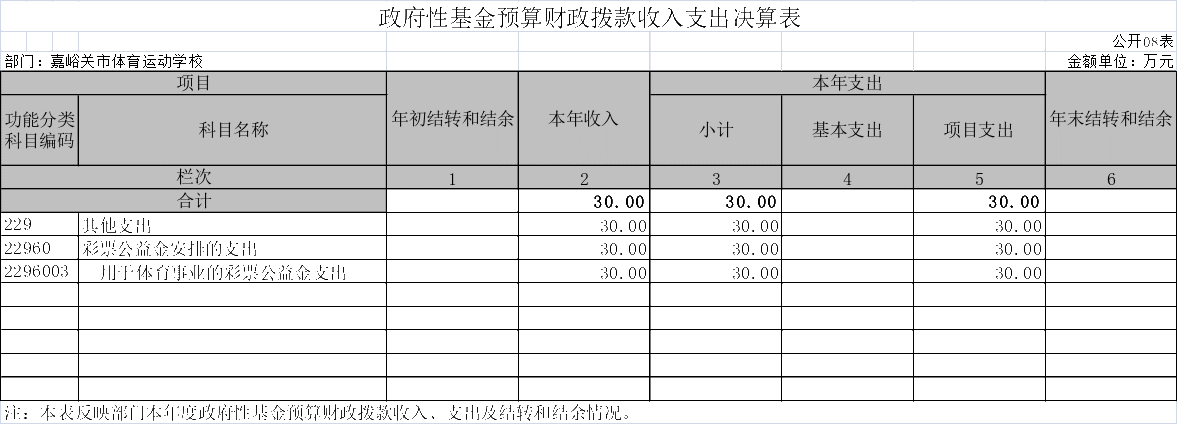 3.其他支出年初预算数为0.00万元,支出决算为30.00万元,完成年初预算的0%,决算数小于预算数的主要原因是本年度追加了省级体彩公益金-资助全省曲棍球项目训练点、资助省市县三级业余训练体系建设经费。