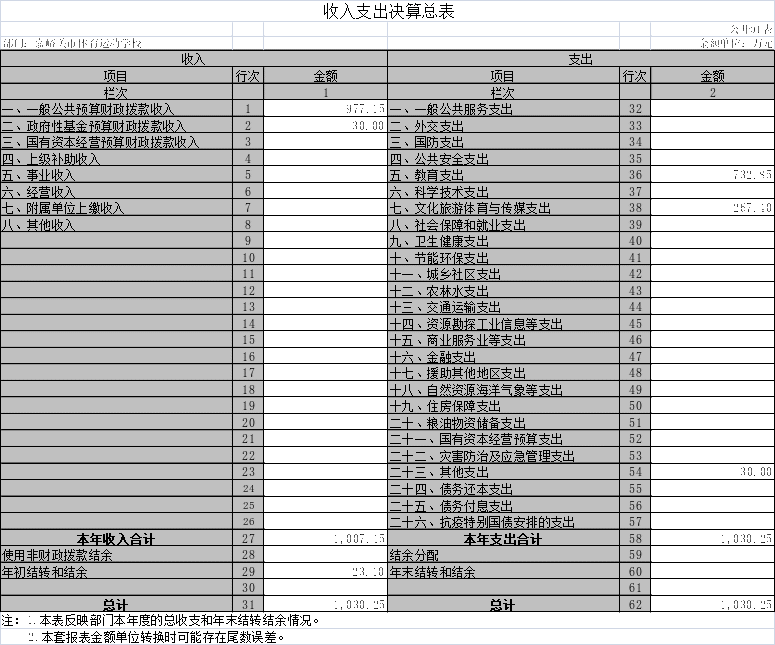 2021年度收入总计1030.25万元,支出总计1030.25万元。与上年度相比,收入增加225.44万元,增长28.01%,支出增加248.54万元,增长31.79%,主要原因:一是2020年年末结转和结余23.10万元(2020年度创城奖和2020年度退休人员慰问金);二是2021年度编制人数人员增加2人(调入1人,新录用1人);三是本年度追加了嘉峪关市体育运动学校健身训练馆场馆建设经费、2021年度甘肃省青少年锦标赛经费等。