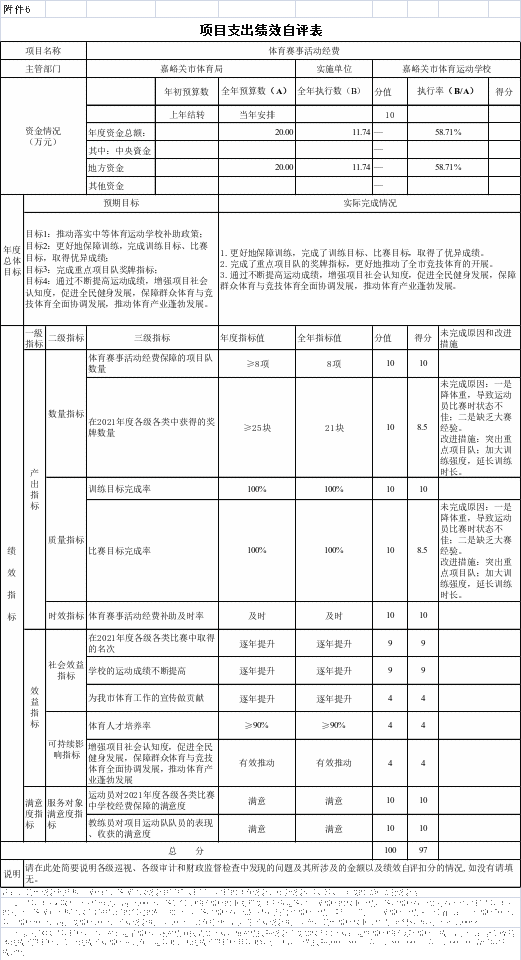 4.体育赛事活动经费项目绩效自评情况:根据年初设定的绩效目标,体育赛事活动经费自评得分97分,项目全年预算数为20万元,执行数为11.74万元,完成预算的58.71%;项目绩效目标完成情况:一是推动落实中等体育运动学校补助政策;二是更好地保障训练,完成训练目标、比赛目标,取得优异成绩;三是完成重点项目队奖牌指标;四是通过不断提高运动成绩,增强项目社会认知度,促进全民健身发展,保障群众体育与竞技体育全面协调发展,推动体育产业蓬勃发展。下一步改进措施:一是突出重点项目队;二是加大训练强度,延长训练时长。。