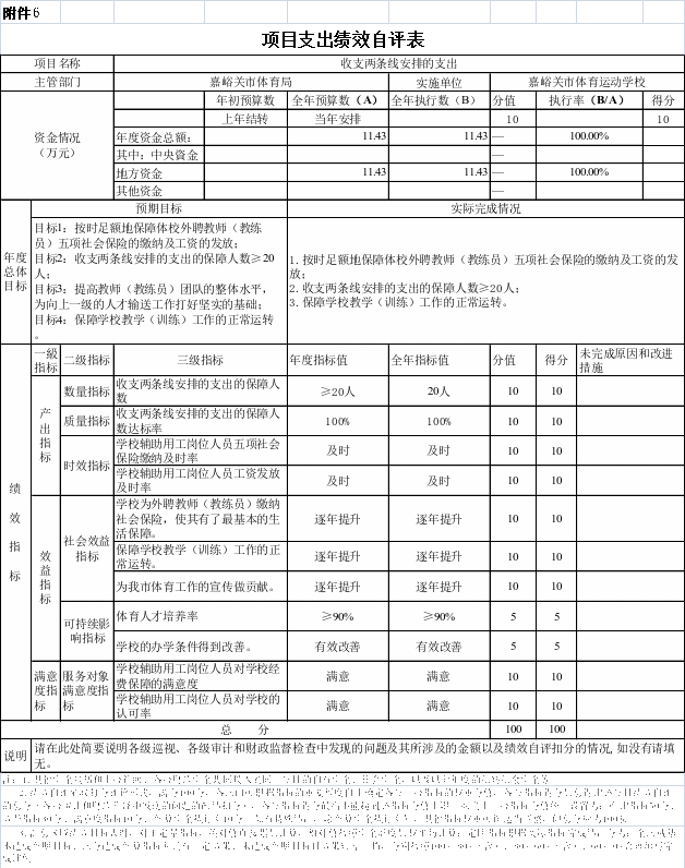 3.收支两条线安排的支出项目绩效自评情况:根据年初设定的绩效目标,收支两条线安排的支出自评得分100分,项目全年预算数为11.43万元,执行数为11.43万元,完成预算的100%;项目绩效目标完成情况:一是按时足额地保障体校外聘教师(教练员)五项社会保险的缴纳及工资的发放;二是收支两条线安排的支出的保障人数≥20人;三是提高教师(教练员)团队的整体水平,为向上一级的人才输送工作打好坚实的基础;四是保障学校教学(训练)工作的正常运转。下一步改进措施:为确保该项目实现预期目标,我单位将继续加强资金管理,专款专用,不挤占、挪用、截留项目资金,充分发挥资金使用效益。