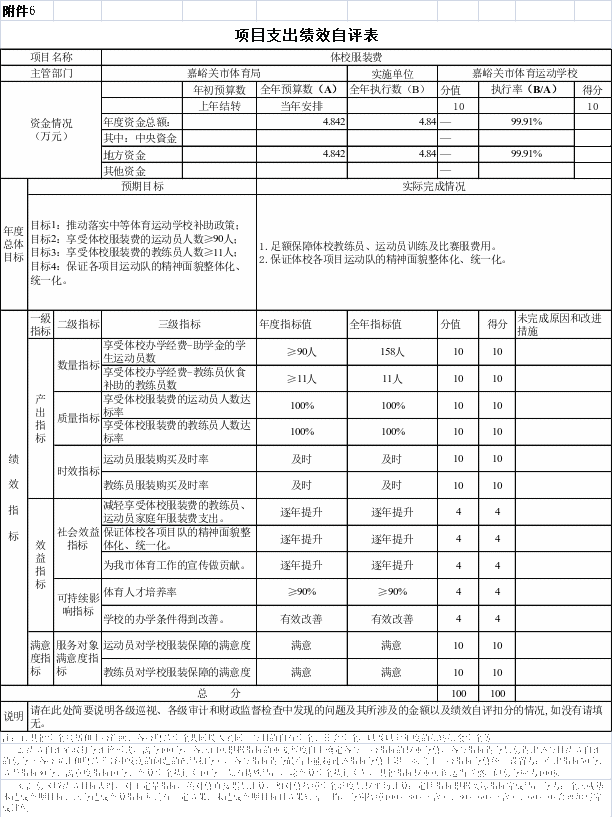 2.体校服装费项目绩效自评情况:根据年初设定的绩效目标,体校服装费自评得分100分,项目全年预算数为4.842万元,执行数为4.837万元,完成预算的99.91%;项目绩效目标完成情况:一是推动落实中等体育运动学校补助政策;二是享受体校服装费的运动员人数≥90人;三是享受体校服装费的教练员人数≥11人;四是保证各项目运动队的精神面貌整体化、统一化。下一步改进措施:一是我校将继续根据《中等体育运动学校管理办法》及学校的相关制度要求,合理、合法、合规地使用项目经费,加强资金管理,专款专用,充分发挥项目经费的使用效益,保证项目顺利实现年初设定的绩效目标;二是项目事前编制详细的预算清单,由校务会研究决定预算中的内容,并进行全面审核;三是严格执行各项采购制度,严格执行项目合同制。