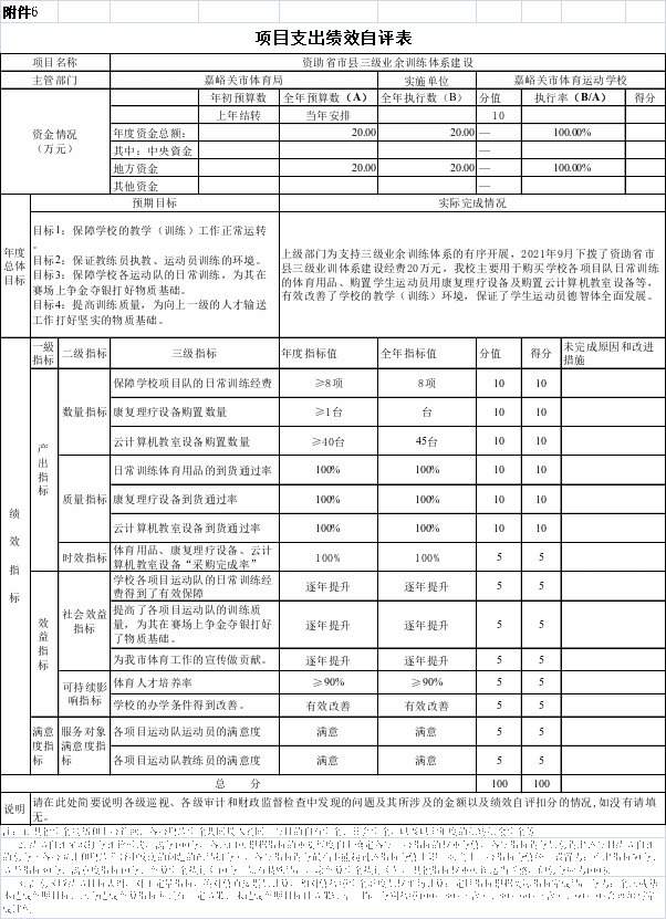 8.资助省、市、县三级业训体系建设项目绩效自评情况:根据年初设定的绩效目标,资助省、市、县三级业训体系建设自评得分100分,项目全年预算数为20万元,执行数为20万元,完成预算的100%;项目绩效目标完成情况:一是保障学校的教学(训练)工作正常运转;二是保证教练员执教、运动员训练的环境;三是保障学校各运动队的日常训练,为其在赛场上争金夺银打好物质基础;四是提高训练质量,为向上一级的人才输送工作打好坚实的物质基础。下一步改进措施:一是我校将继续根据《体彩公益金管理办法》及学校的相关制度要求,合理、合法、合规地使用项目经费,加强资金管理,专款专用,充分发挥体彩公益金的使用效益,保证项目顺利实现年初设定的绩效目标。