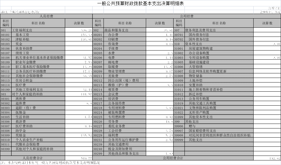 五、基本支出:指为保障机构正常运转、完成日常工作任务而发生的人员经费和公用经费。其中:人员经费指政府收支分类经济科目中的“工资福利支出”和“对个人和家庭的补助”;公用经费指政府收支分类经济科目中除“工资福利支出”和“对个人和家庭的补助”外的其他支出。