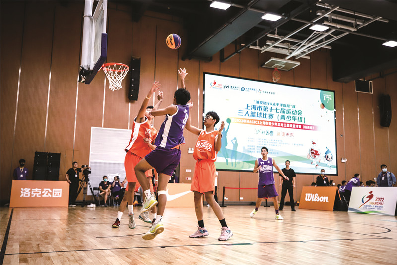 体育馆里一片热火朝天,这里举办的是上海市第十七届运动会三人篮球比赛(青少年组)暨2022年MAGIC3上海市青少年三对三超级篮球赛(精英组),来自上海市14个区的46支队伍、266名选手报名参赛,申城掀起一场篮球青春风暴。